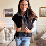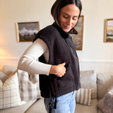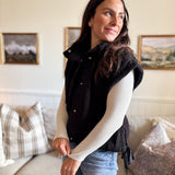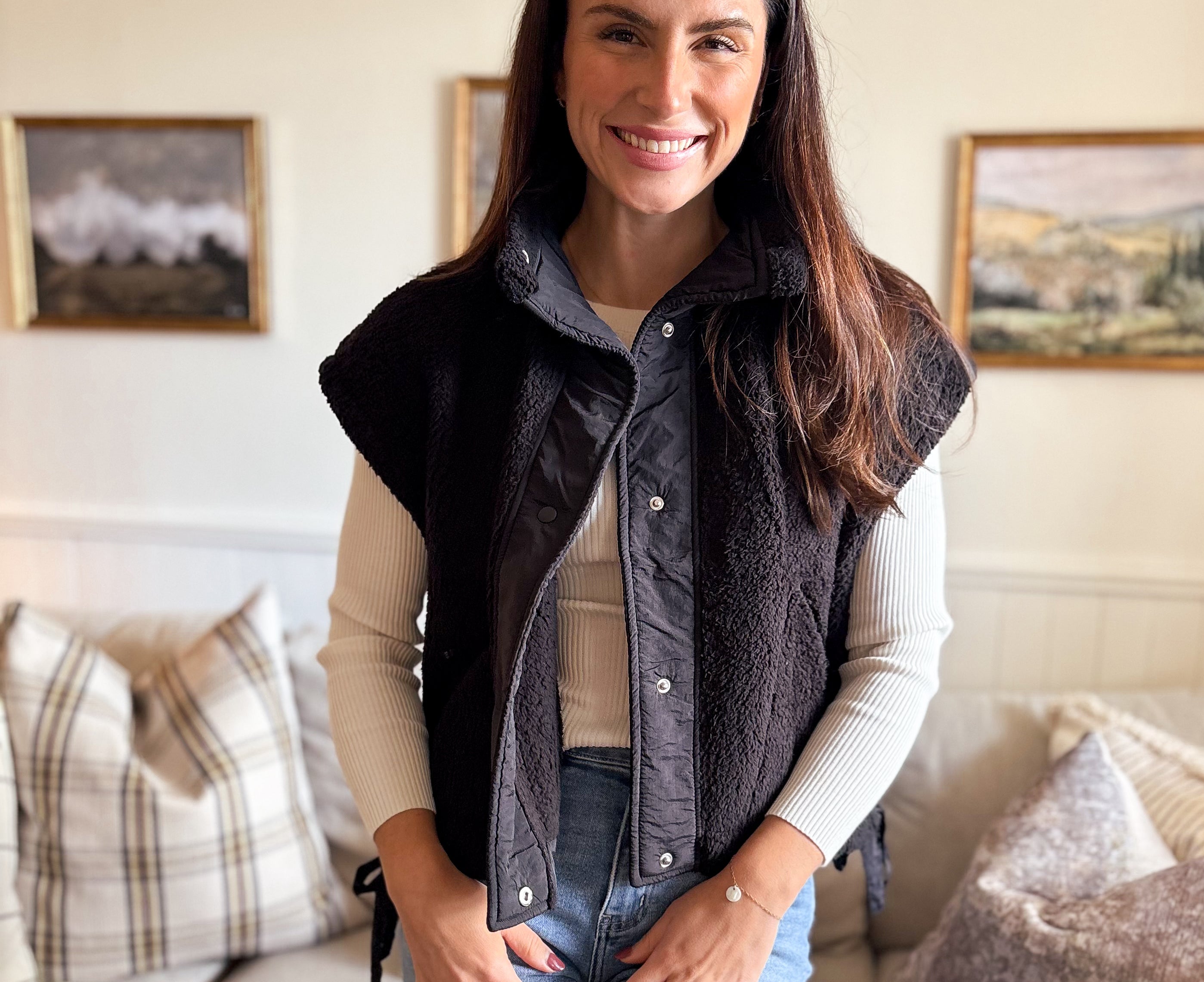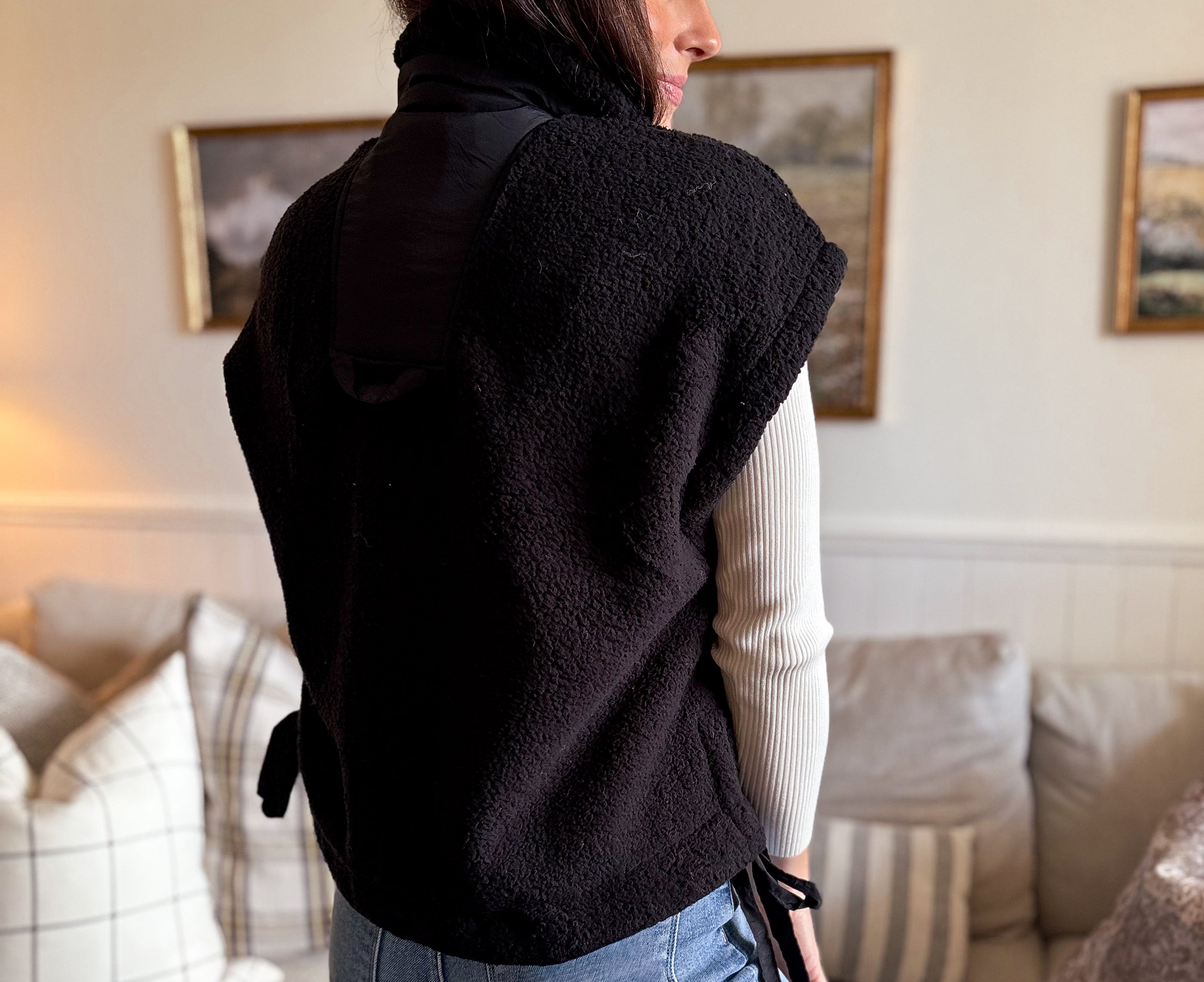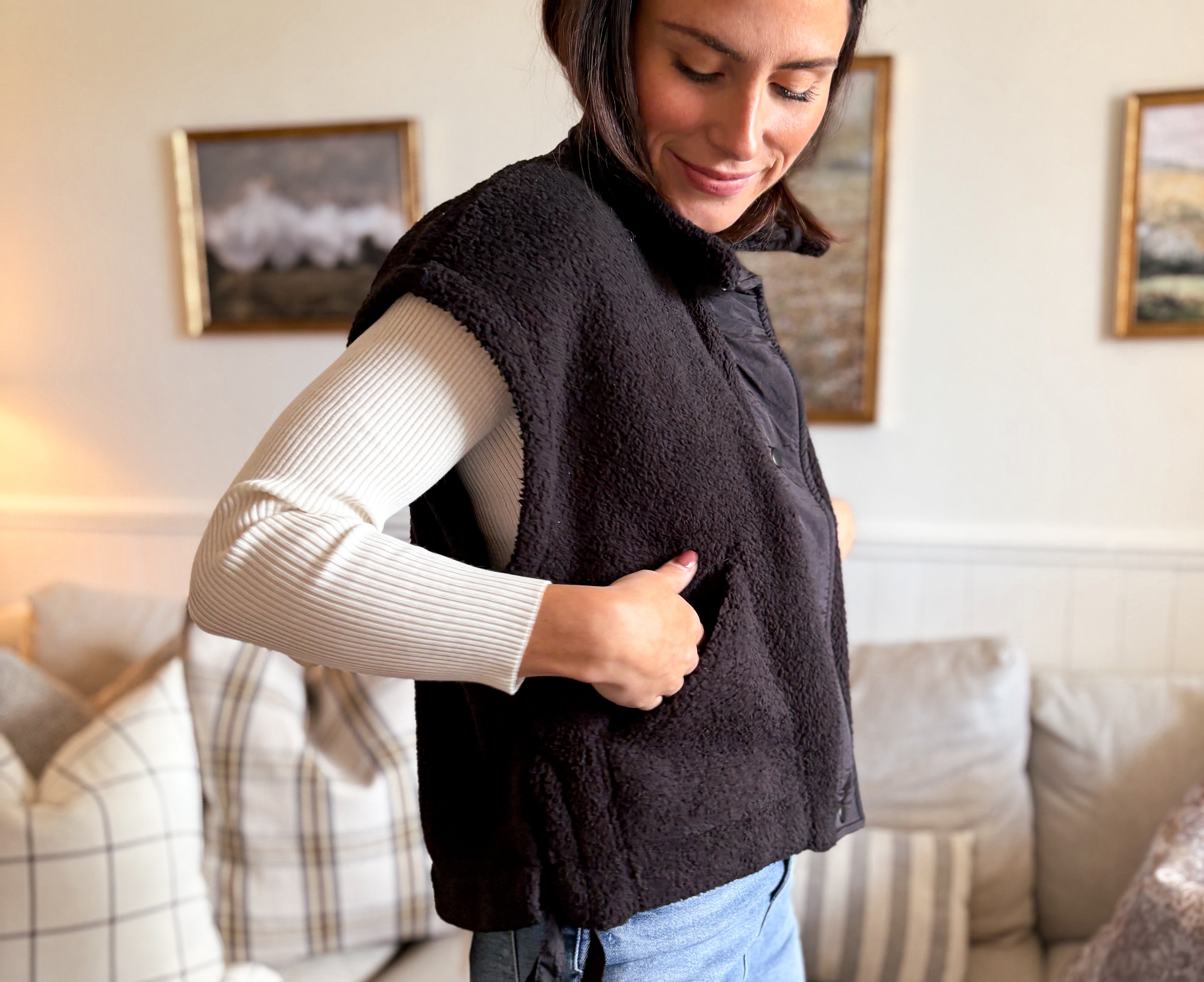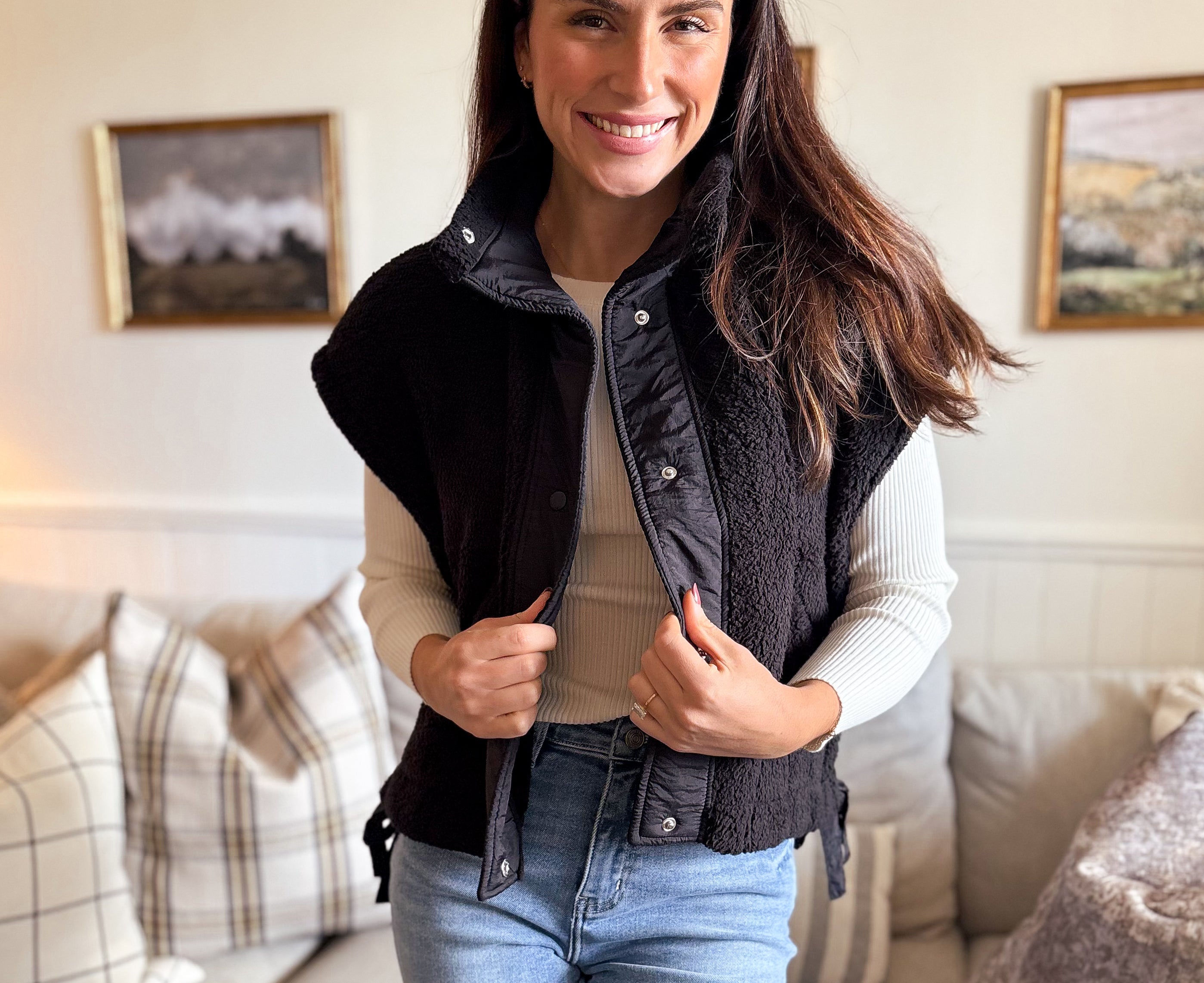 Wrap yourself in cozy comfort with this oversized sherpa vest, designed for effortless style and everyday versatility. Featuring convenient button tabs and functional pockets, it's the perfect layering piece that transitions seamlessly from casual outings to relaxed weekends. The soft sherpa fabric provides warmth without bulk, while the relaxed fit flatters all body types. Whether you're running errands or settling in at home, this black vest delivers the comfort and practicality you've been looking for.