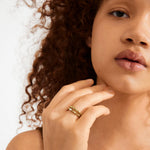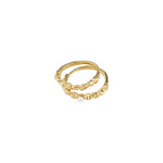 The gold-plated or silver-plated SHIFT ring set from Pilgrim is crafted for those who love a stacked look with a touch of romantic elegance. Featuring two rings with an organic shaped design and shiny finish, one boasts a tiny pearl-coloured glass bead that adds a dreamy touch. Mix them with more rings for a stacked power look, or wear them alone for a subtle, classy expression. Style with mocha-toned nail polish and a chunky sweater for an effortless, winter-chic vibe. The rings are adjustable and made from 85% recycled materials – style with care.