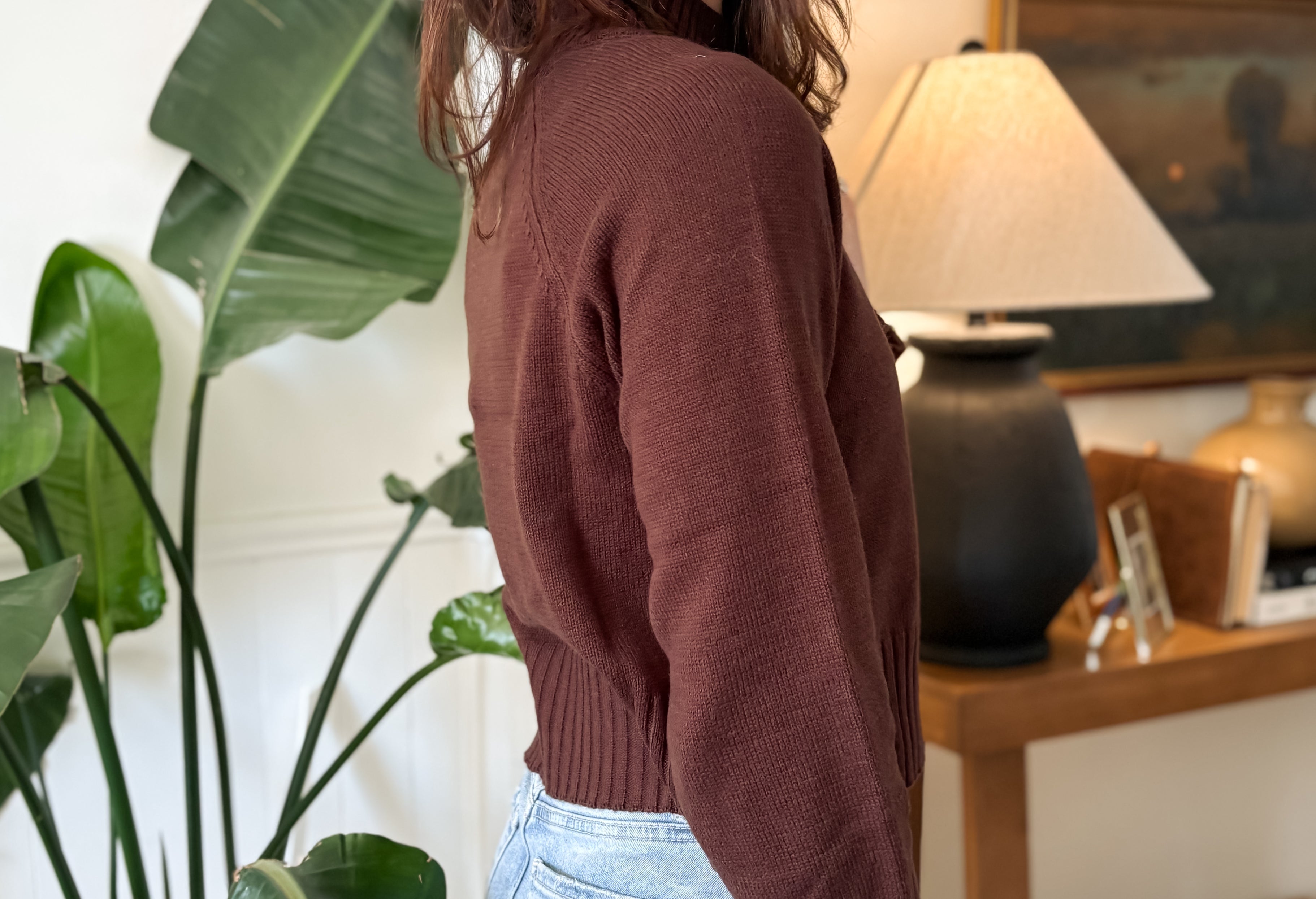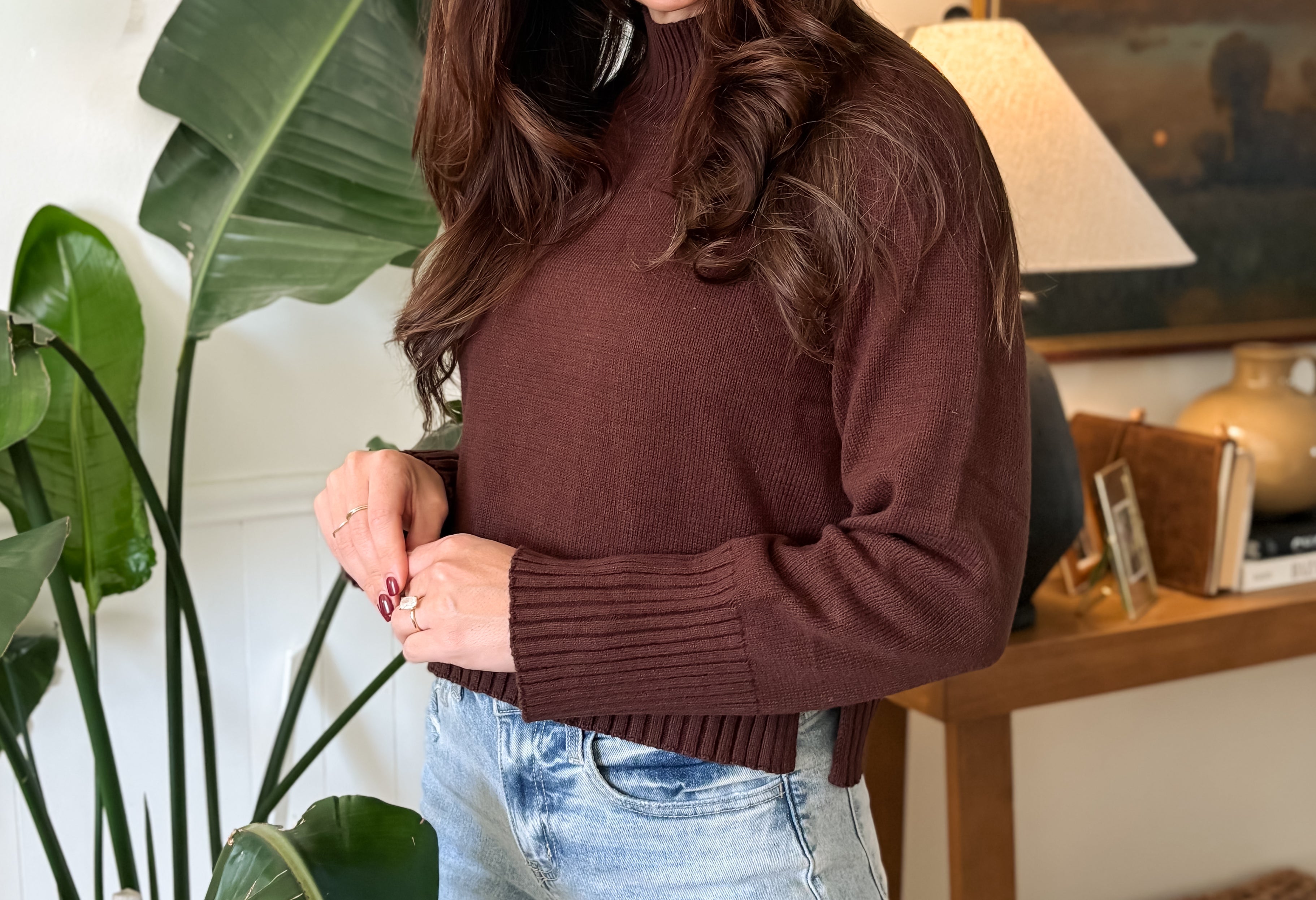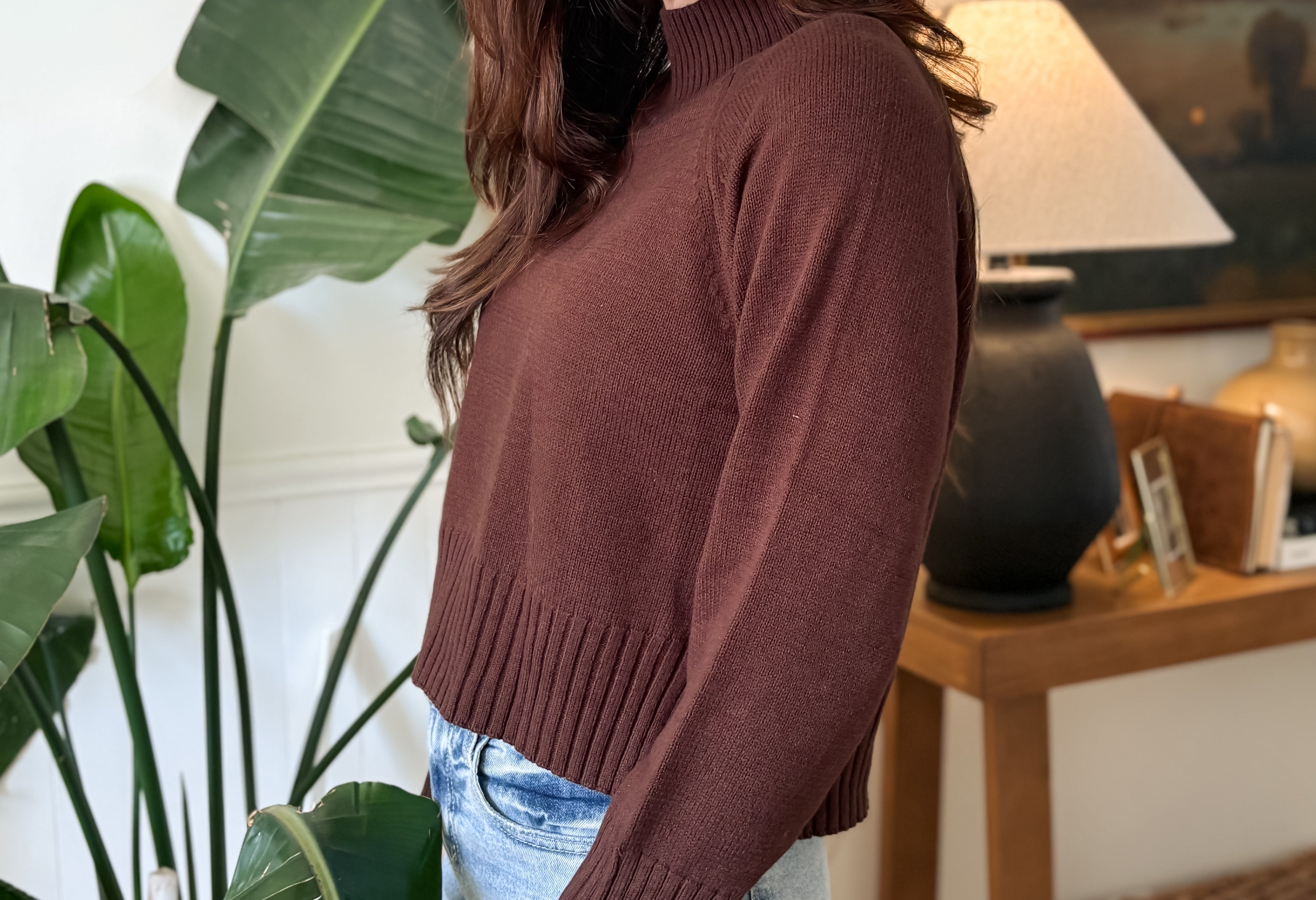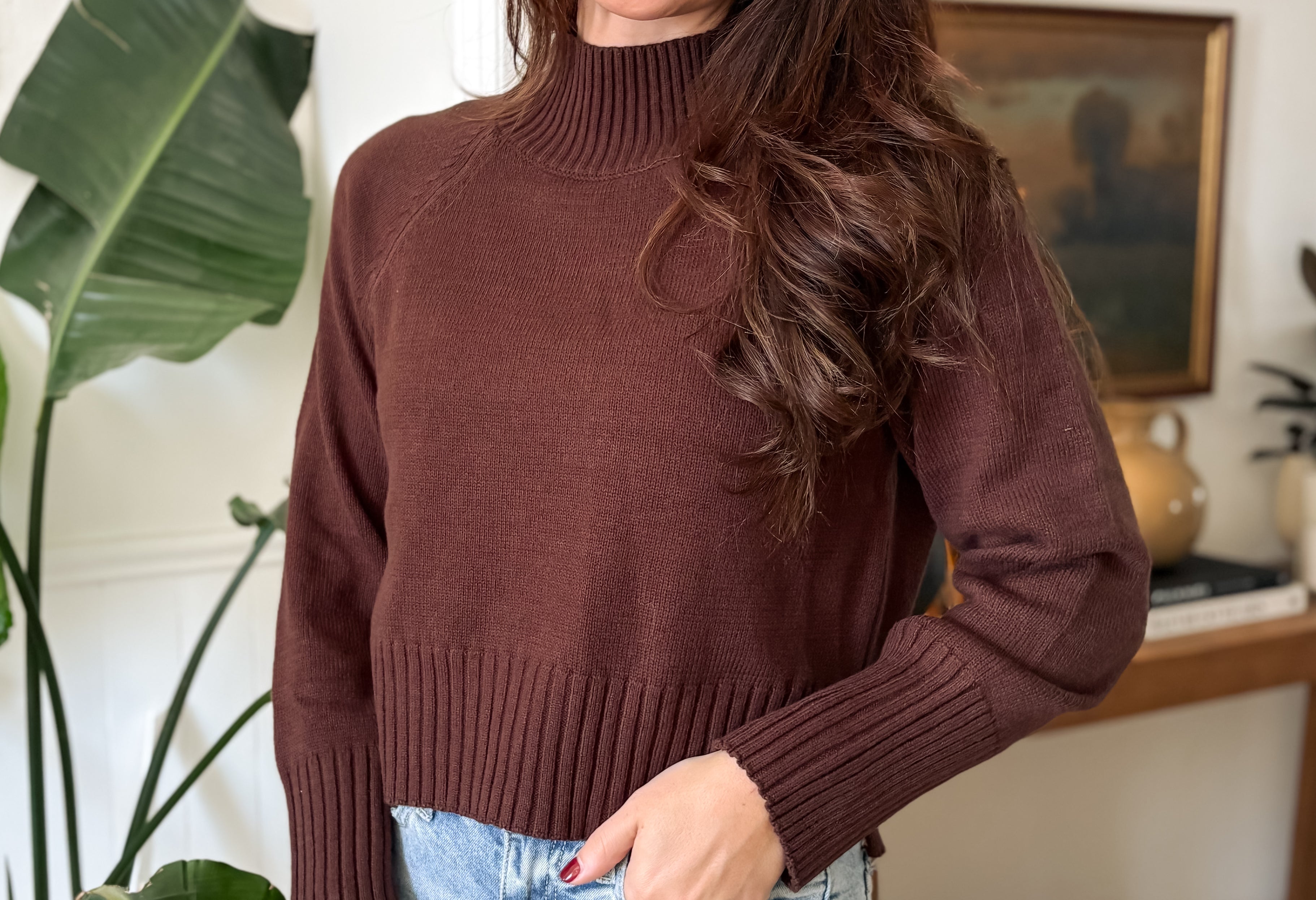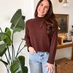Elevate your wardrobe with the Stella Mock Neck Knit Pullover. This lightly cropped, long-sleeve pullover in rich chocolate brown offers both style and comfort. The soft knit fabric and mock neck design keep you cozy while adding a chic touch to any outfit. Perfect for layering or wearing on its own, it blends effortlessly with your favourite jeans or skirts for an effortlessly polished look.