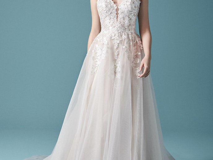 A cold-shoulder bishop sleeve princess wedding dress for A) looking like you stepped out of a Pre-Raphaelite painting, and B) happy-crying with your betrothed.