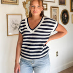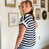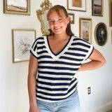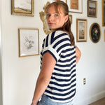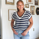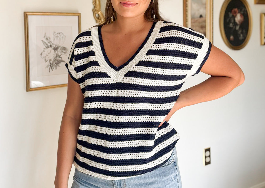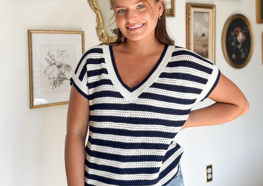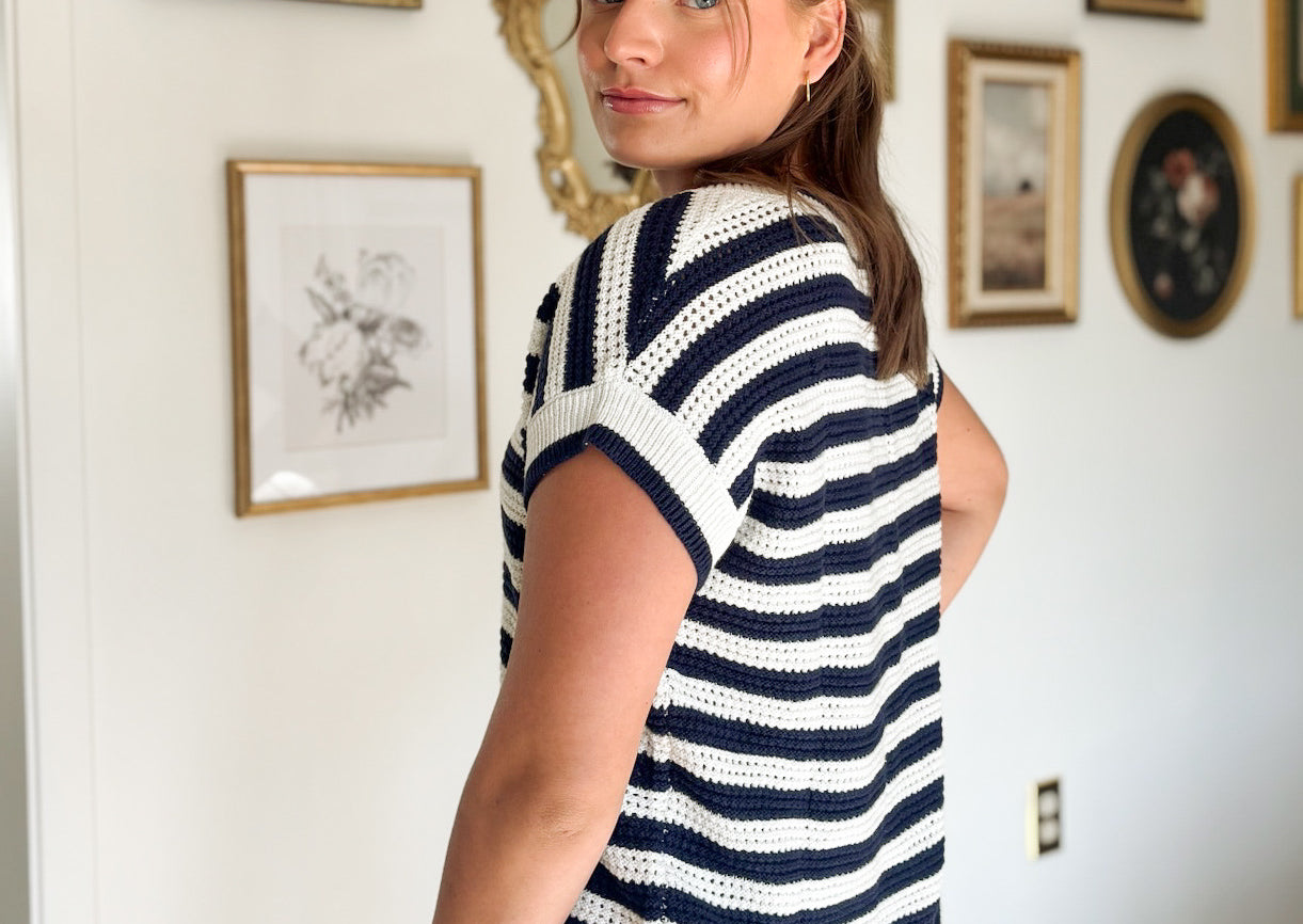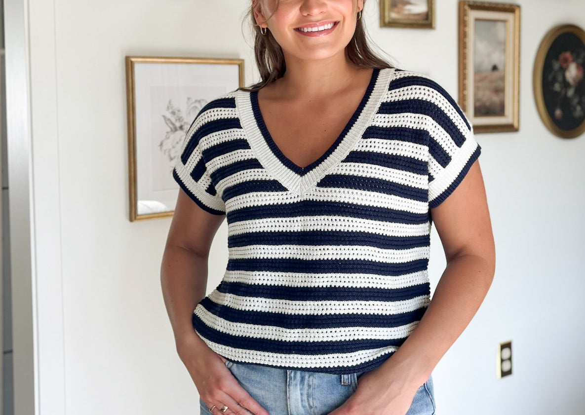 The Sophia Stripe V Neck Crochet Knit Short Sleeve Sweater