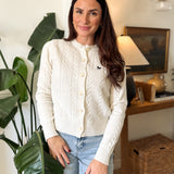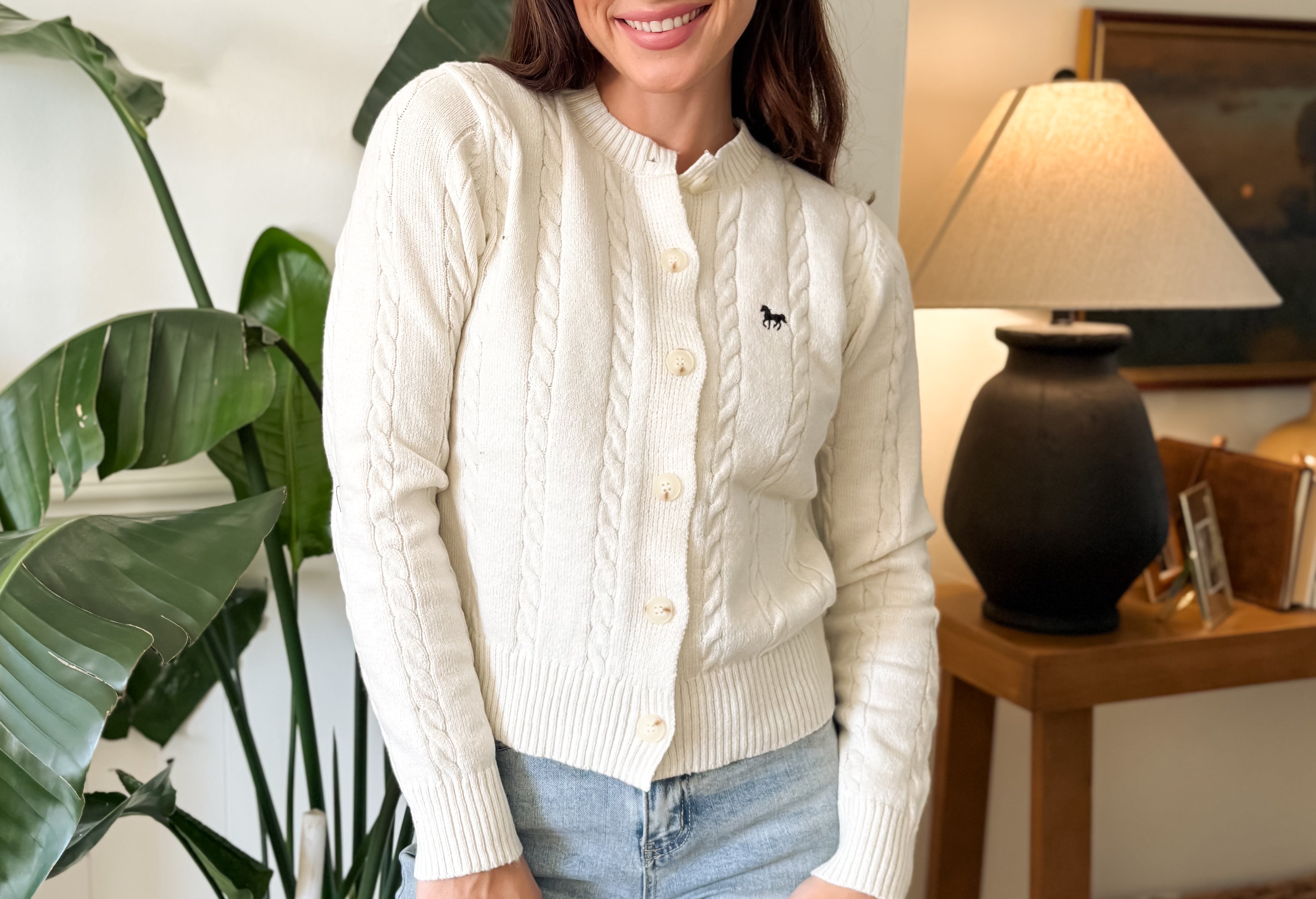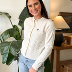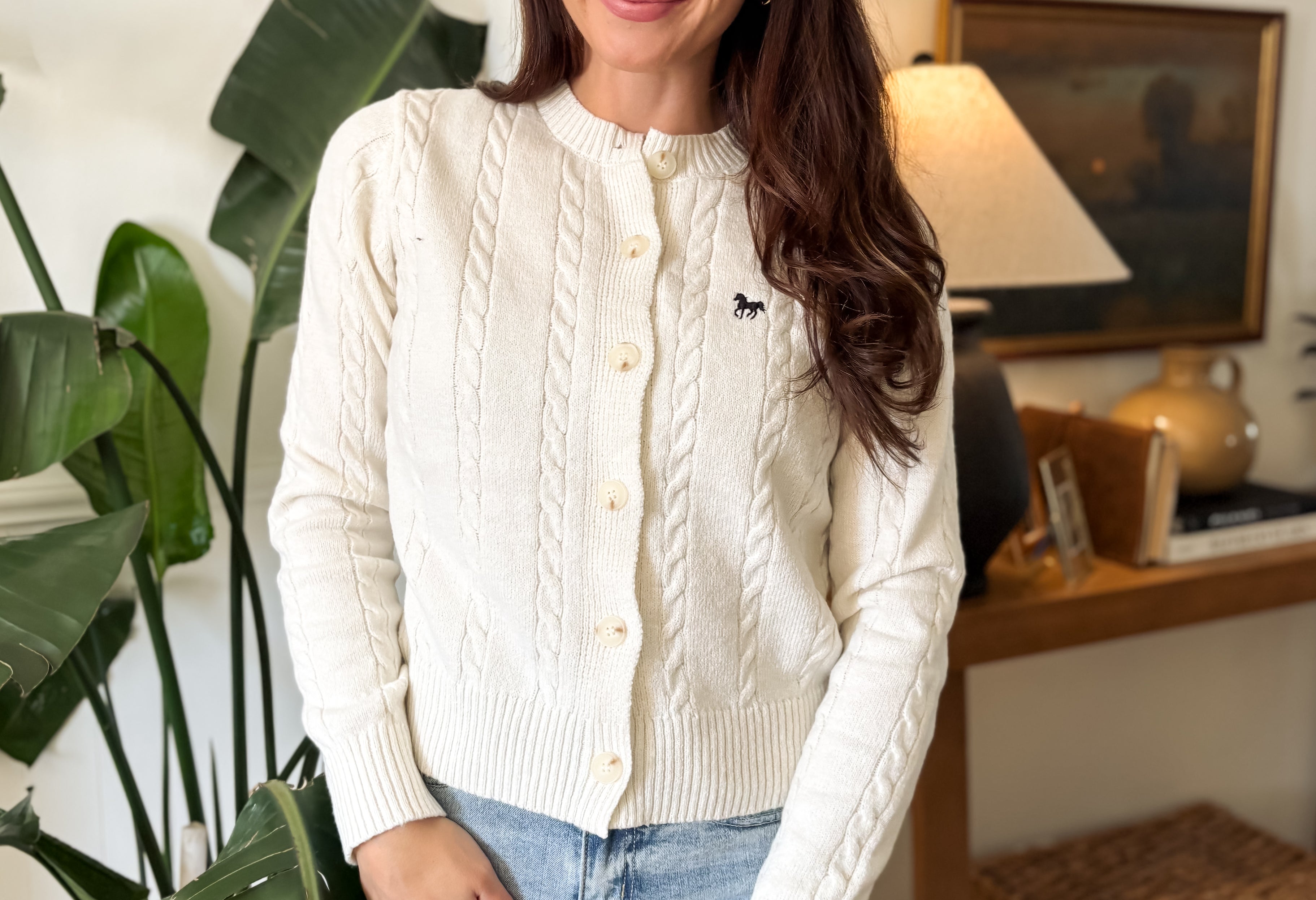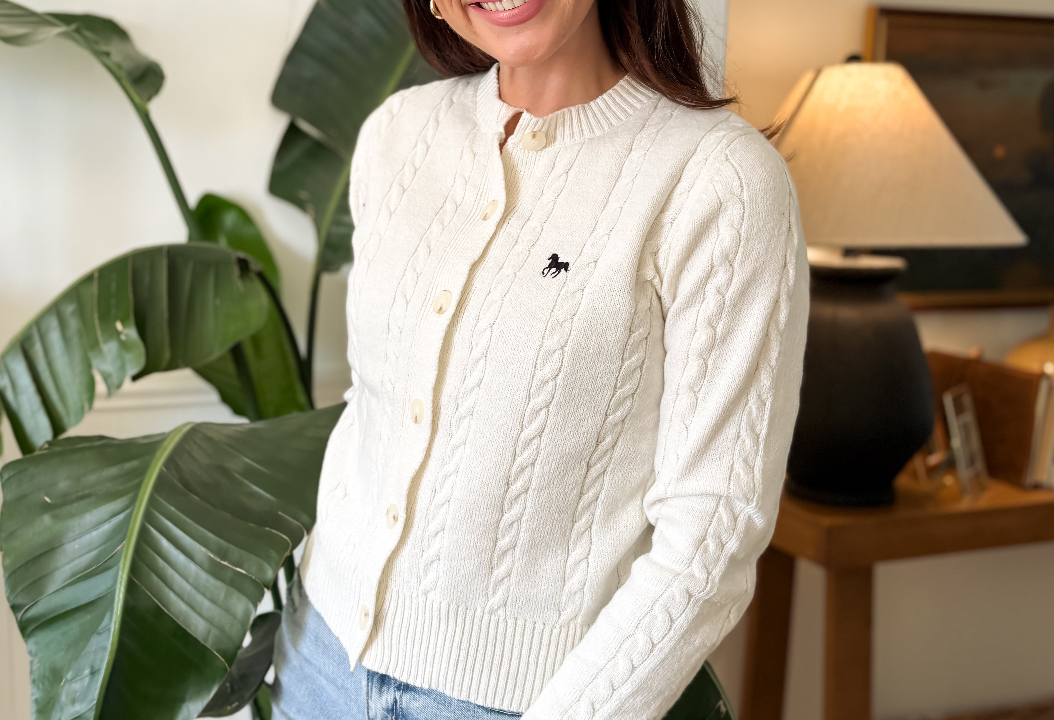 Elevate your wardrobe with the Sylvie Cable Knit Cardigan, combining classic preppy style with modern comfort. This cream off-white knit features a flattering round neckline and a button-down front with elegant tortoise shell buttons. The subtle stretch ensures a perfect fit, while the detailed horse embroidered logo adds a refined touch. Ideal for layering, it delivers warmth and timeless sophistication to your everyday look.
