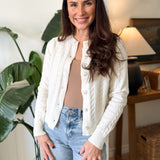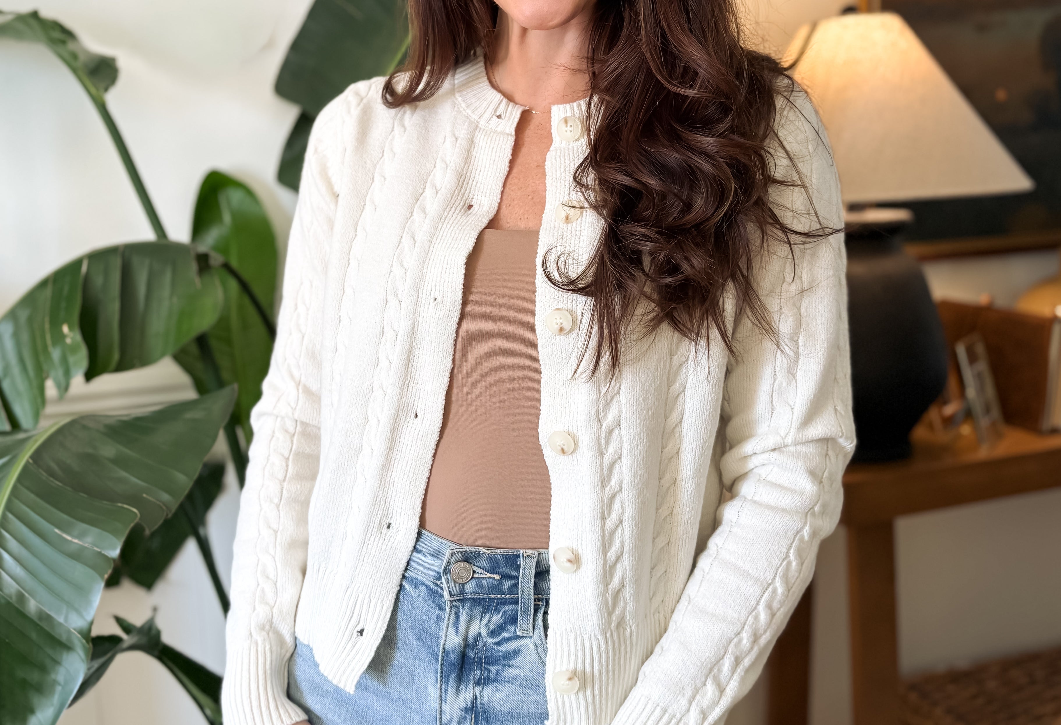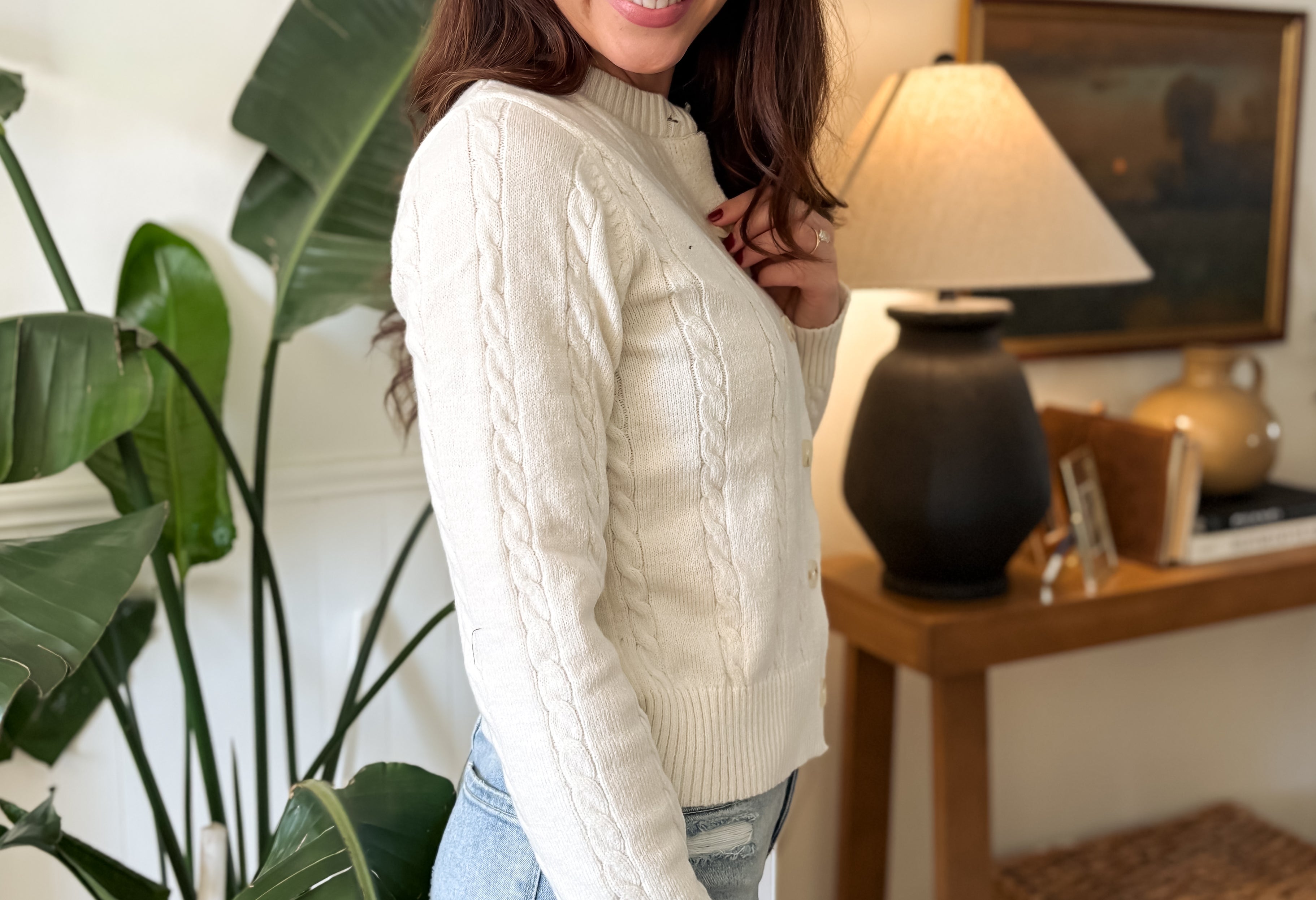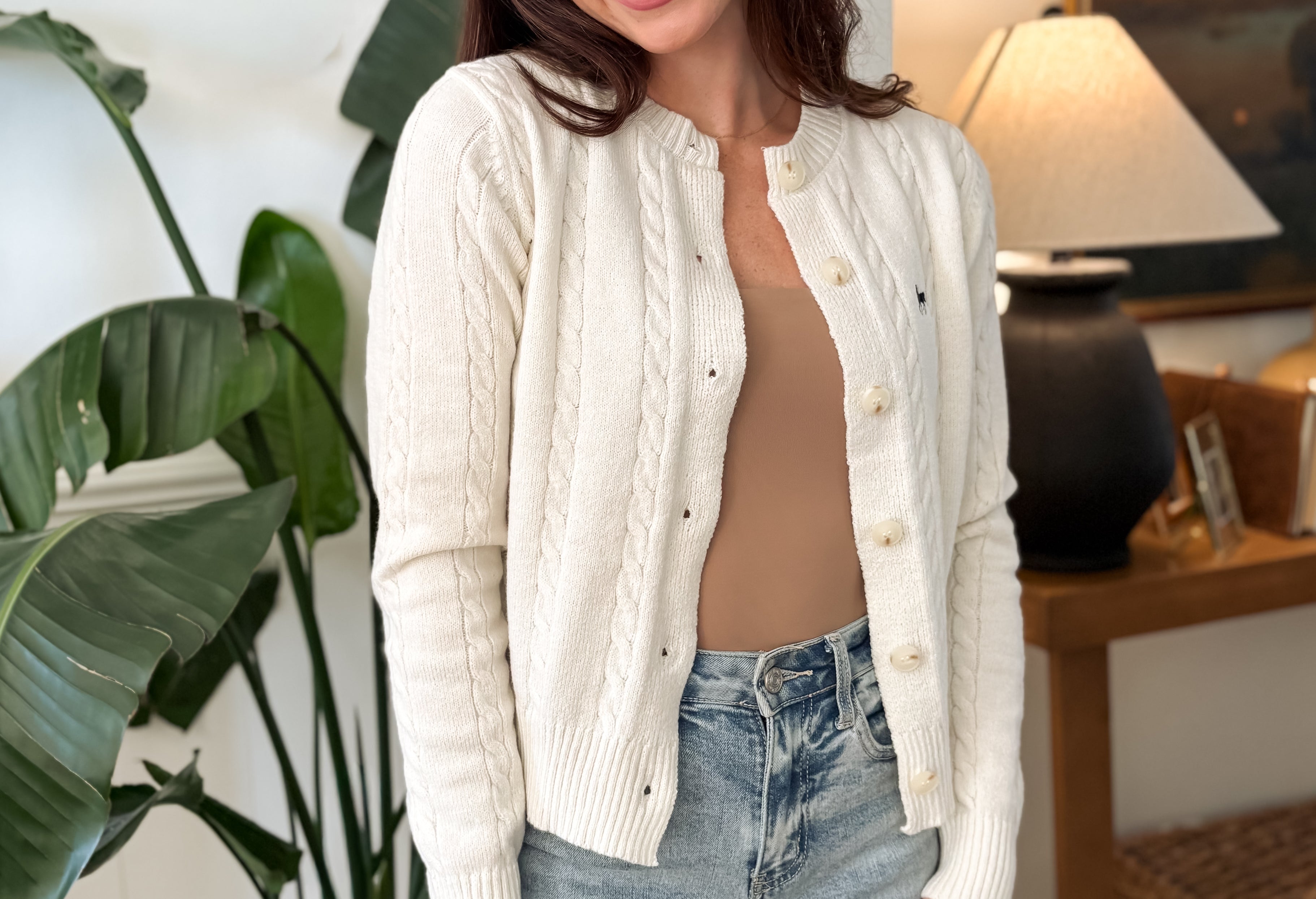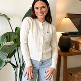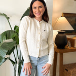 Elevate your wardrobe with the Sylvie Cable Knit Cardigan, combining classic preppy style with modern comfort. This cream off-white knit features a flattering round neckline and a button-down front with elegant tortoise shell buttons. The subtle stretch ensures a perfect fit, while the detailed horse embroidered logo adds a refined touch. Ideal for layering, it delivers warmth and timeless sophistication to your everyday look.