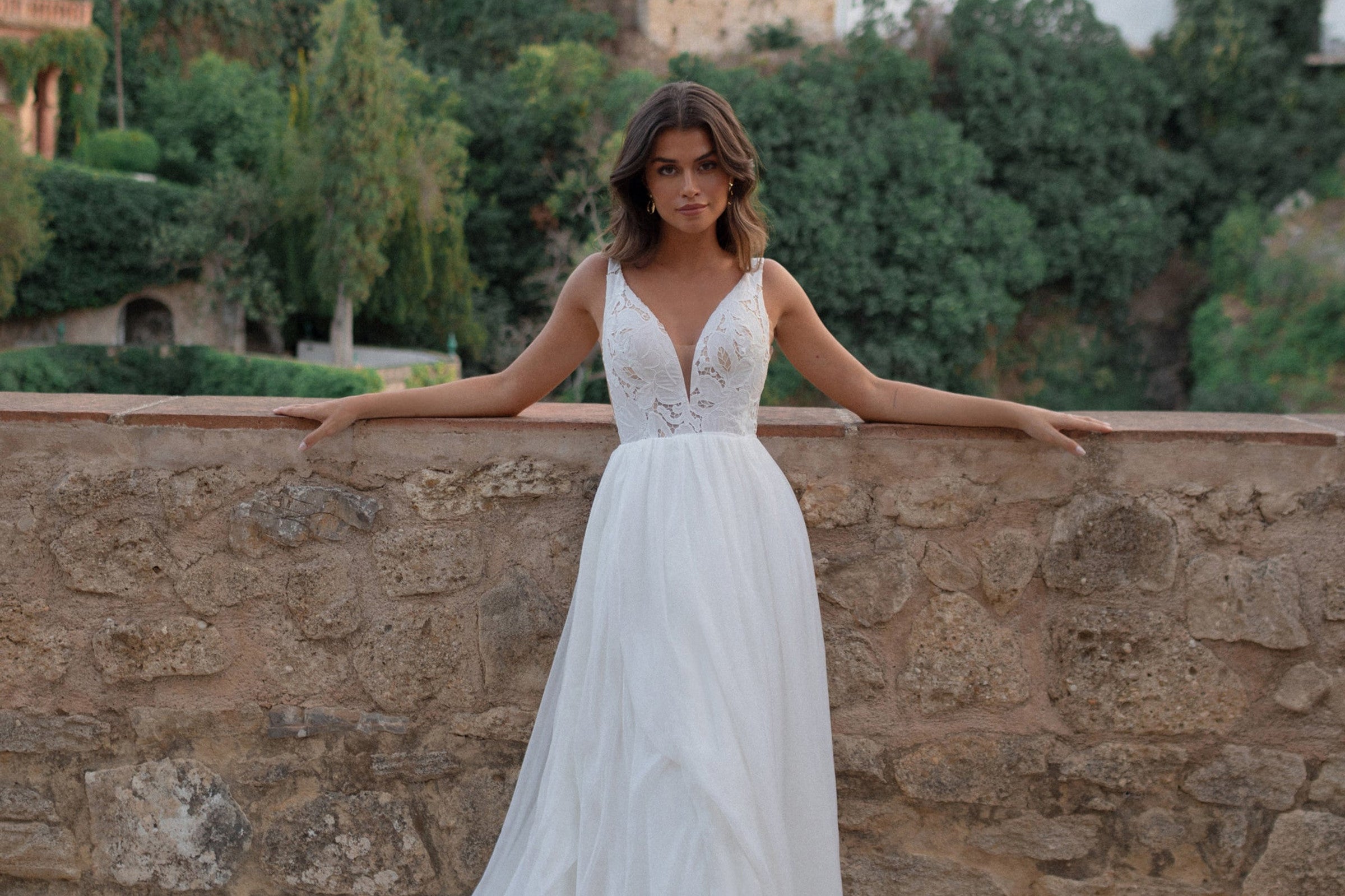 Tallulah's classic A-line silhouette pairs a chiffon skirt with a sleeveless embroidered lace bodice.