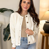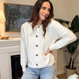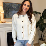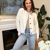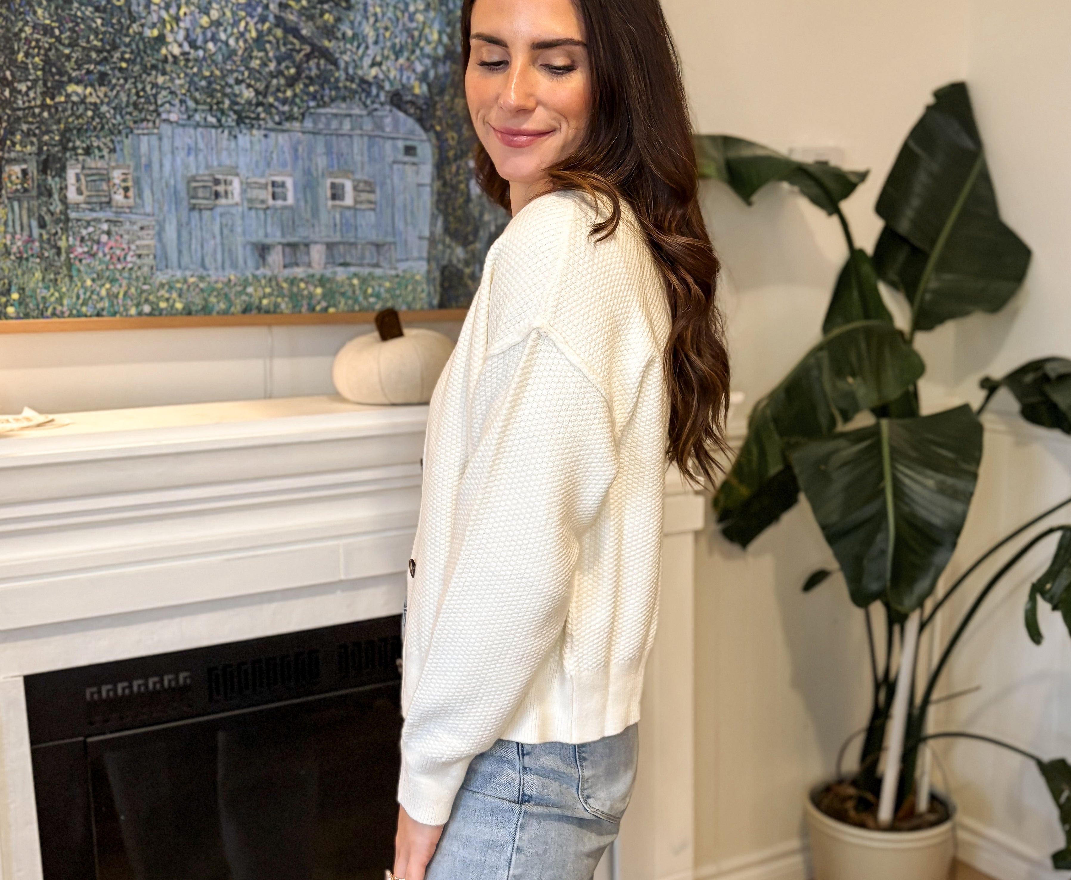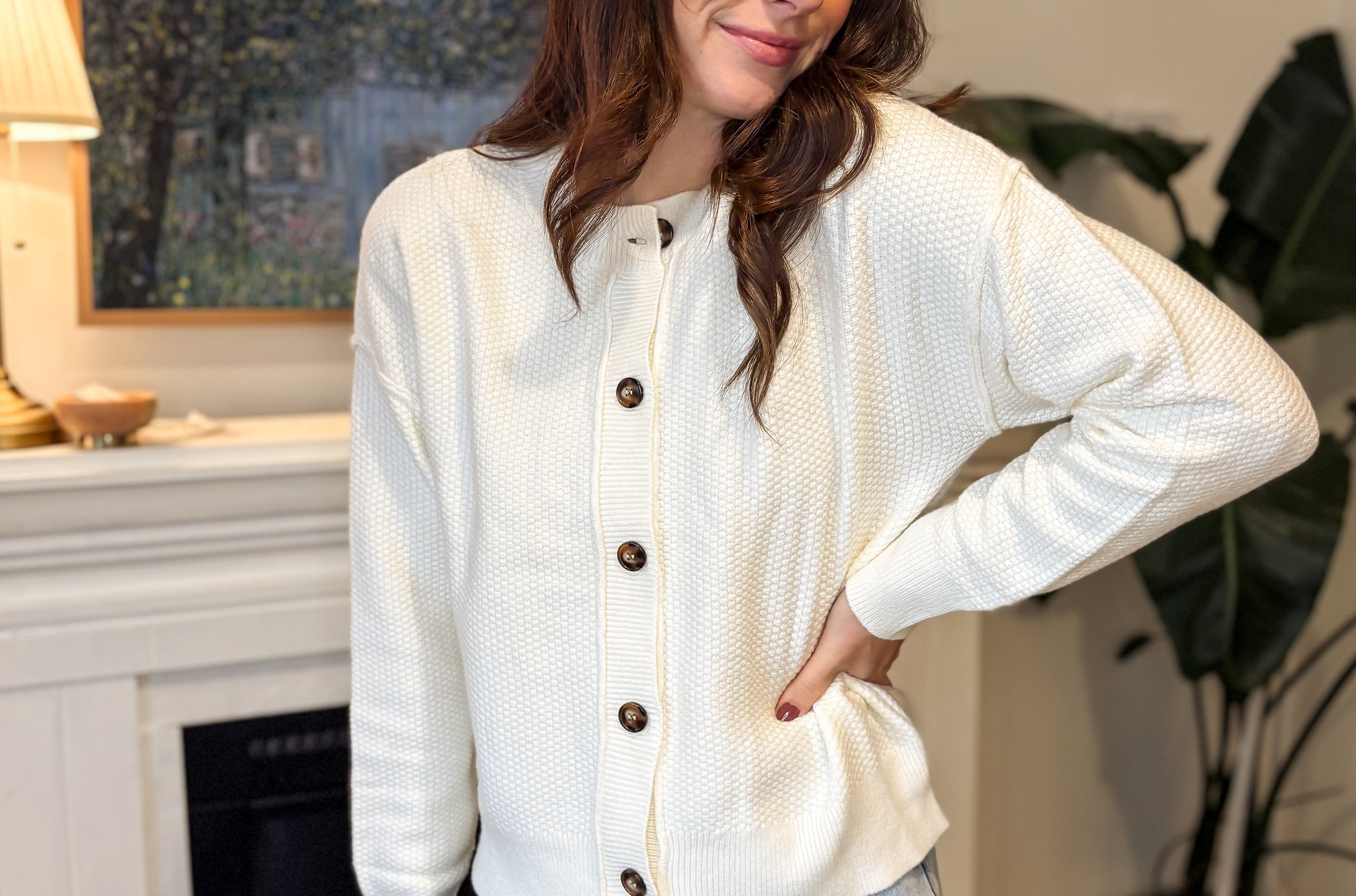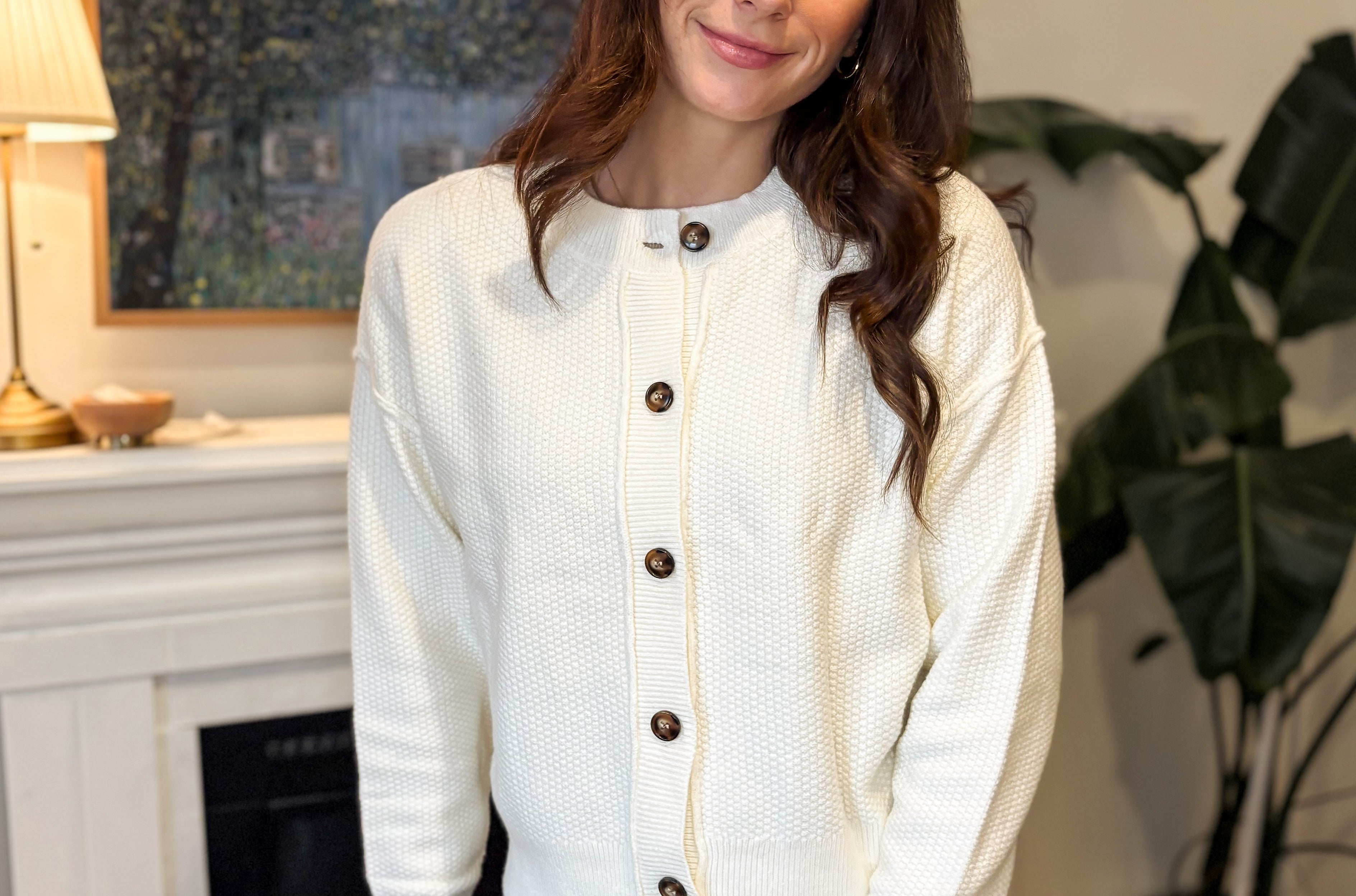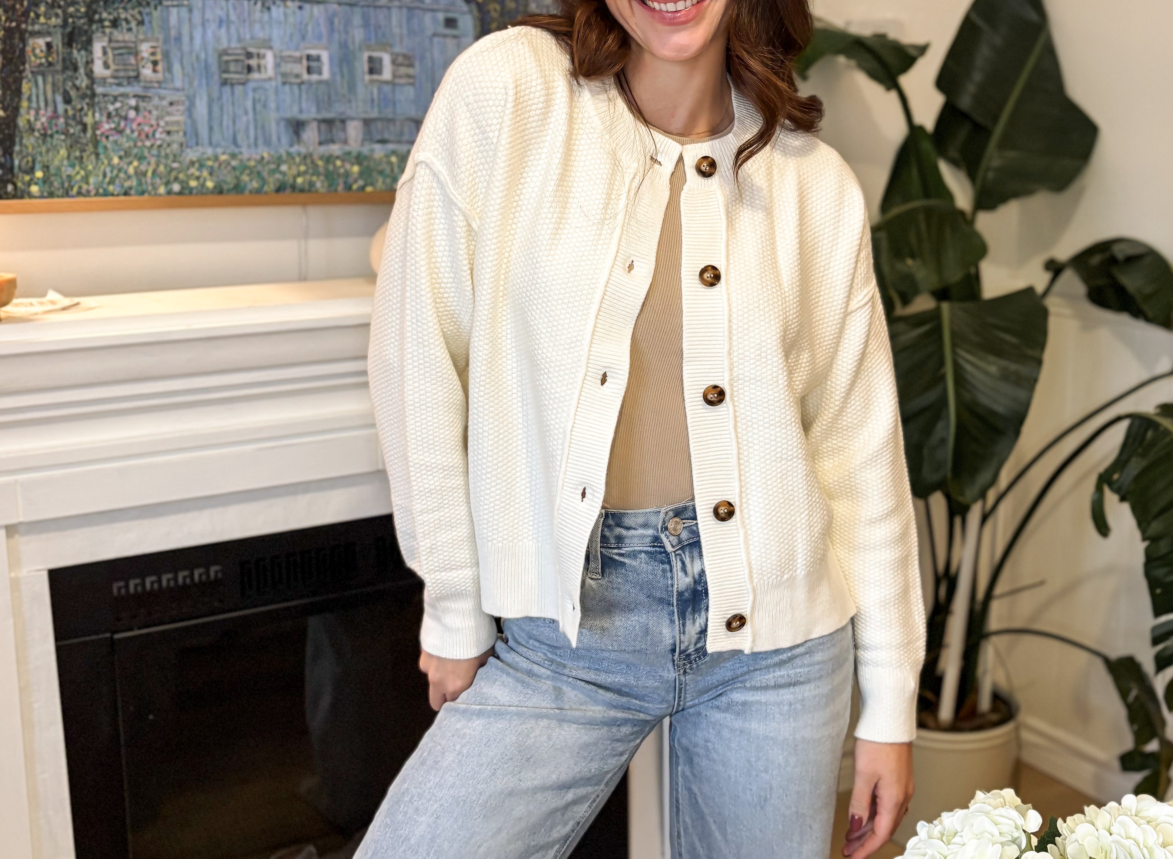 Elevate your wardrobe with the Ellie Exposed Seam Button Down Knit Cardigan in a soft cream shade. Its unique exposed seams add modern texture, while the button-down front offers versatile styling options. Crafted from cozy knit fabric, this cardigan provides comfortable warmth without compromising on style. Perfect for layering, it effortlessly transitions from casual days to polished evenings, making it a must-have staple for your closet.