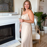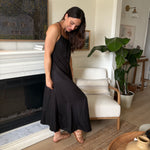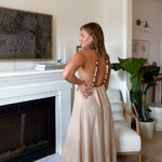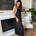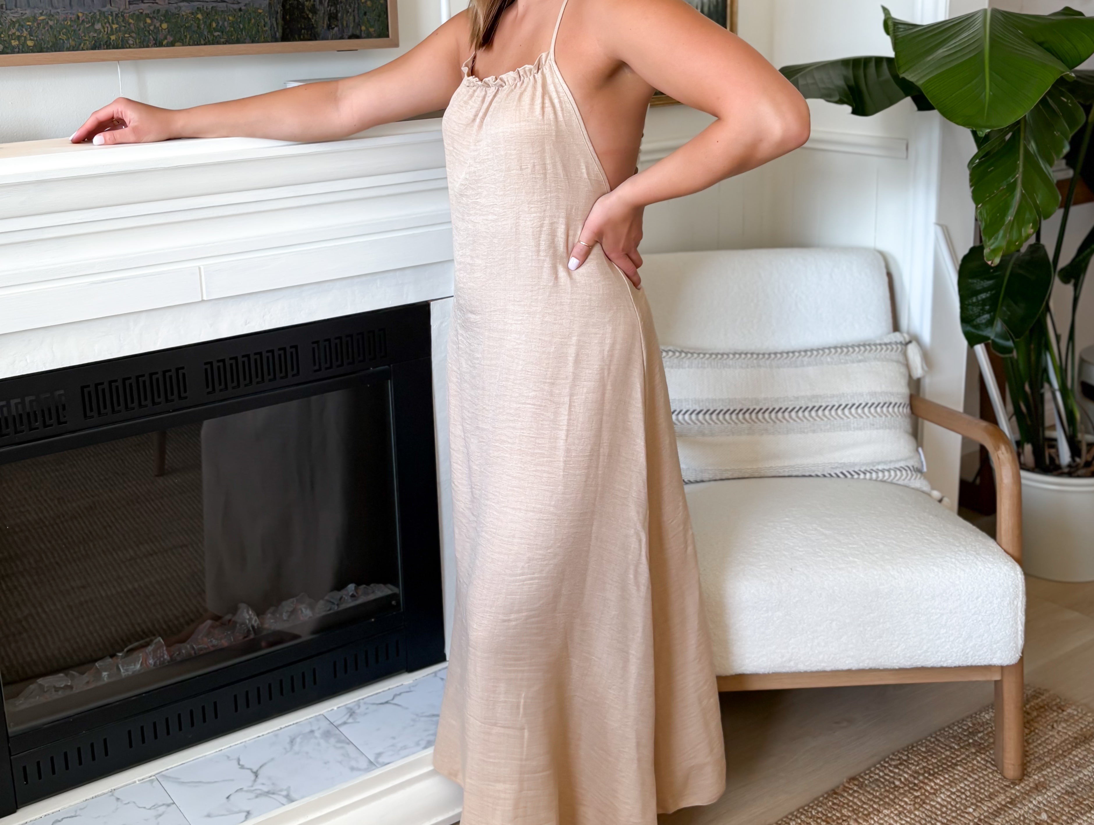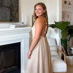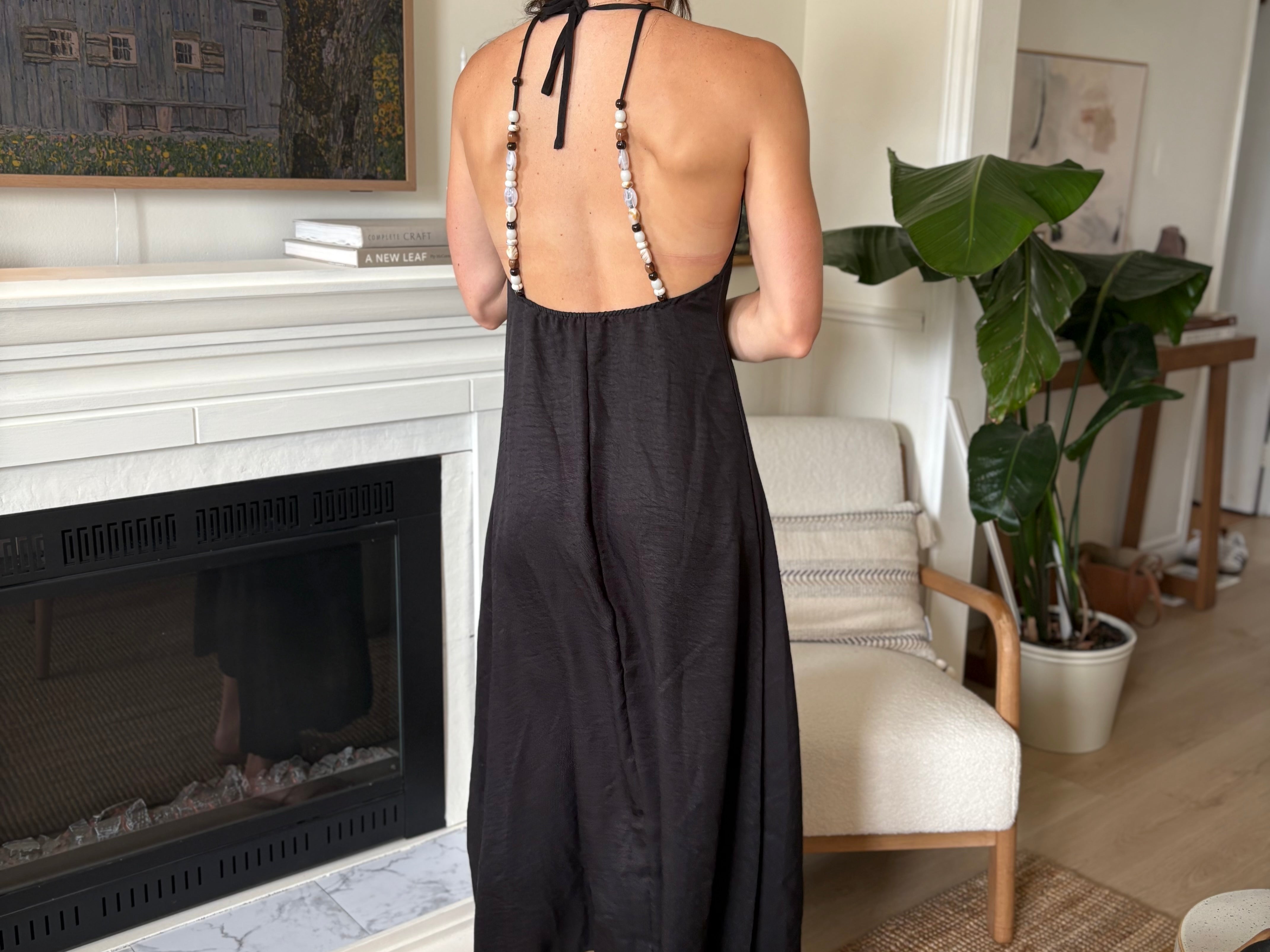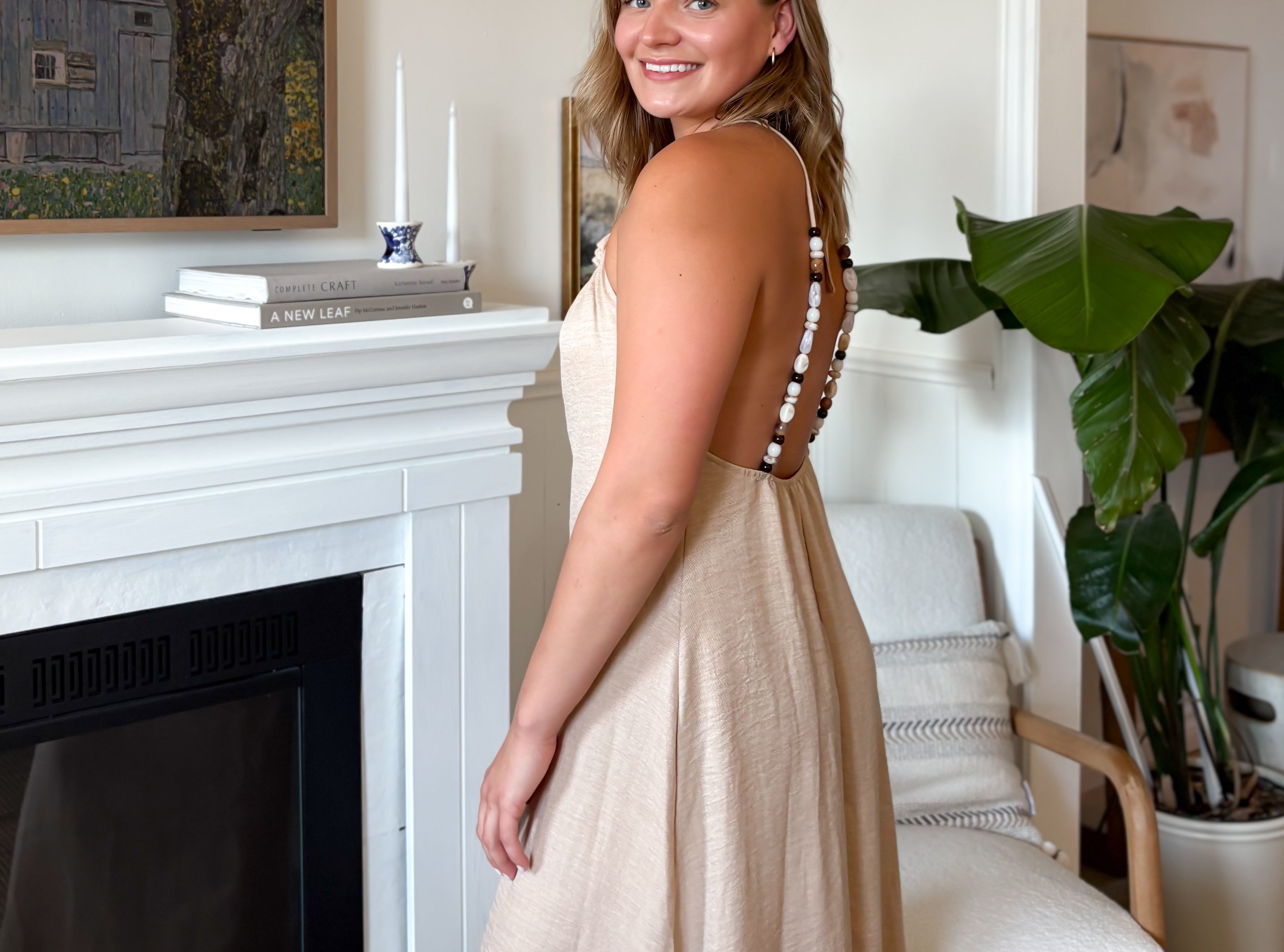 The Everleigh Beaded Back Maxi Sundress features a flattering halter style with a tie-back design, ensuring a perfect fit. Its maxi length and woven texture create an elegant silhouette, while the stunning decorative beaded strap adds a touch of sophistication. Ideal for warm days and special occasions, this sundress combines comfort and style effortlessly.