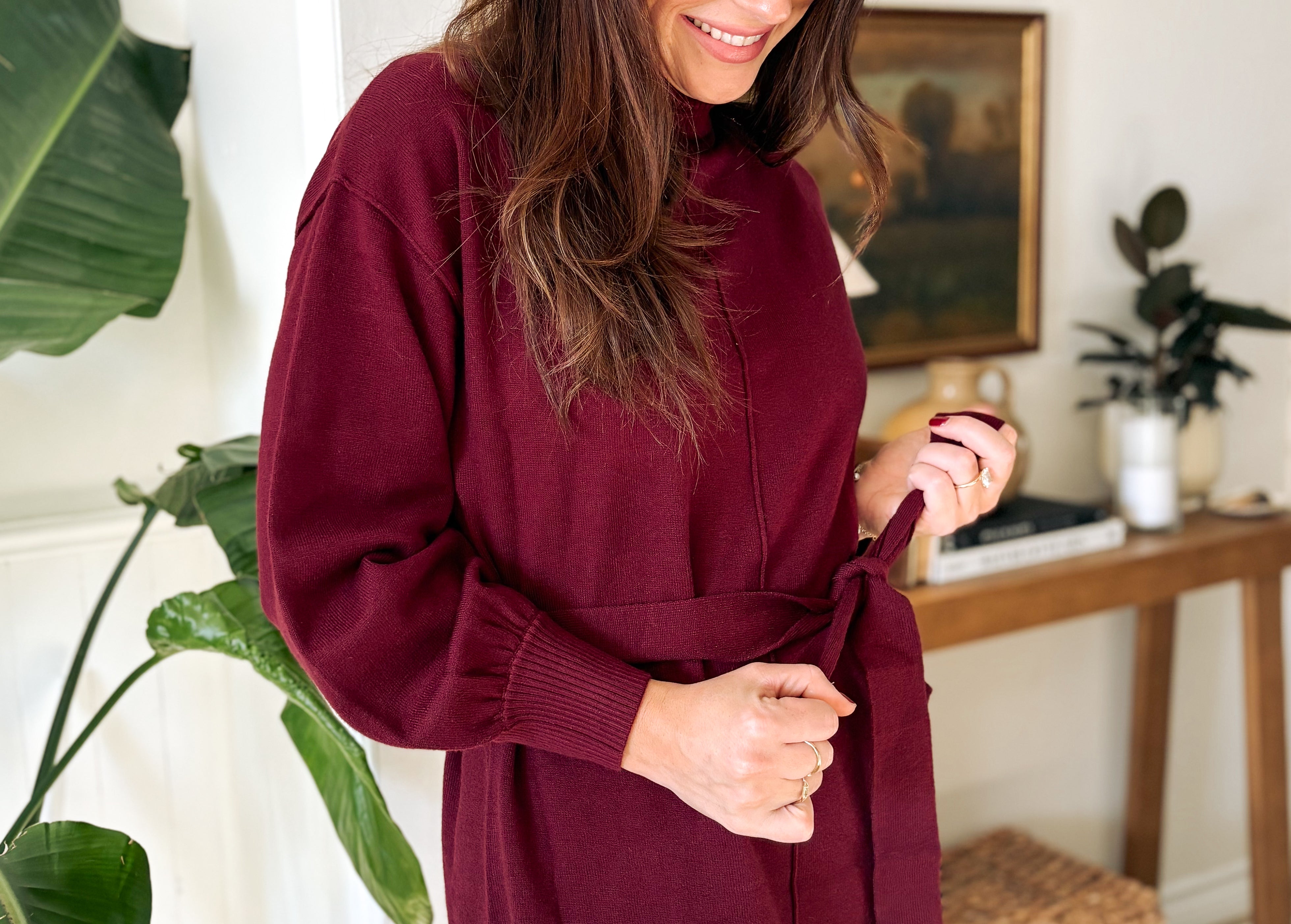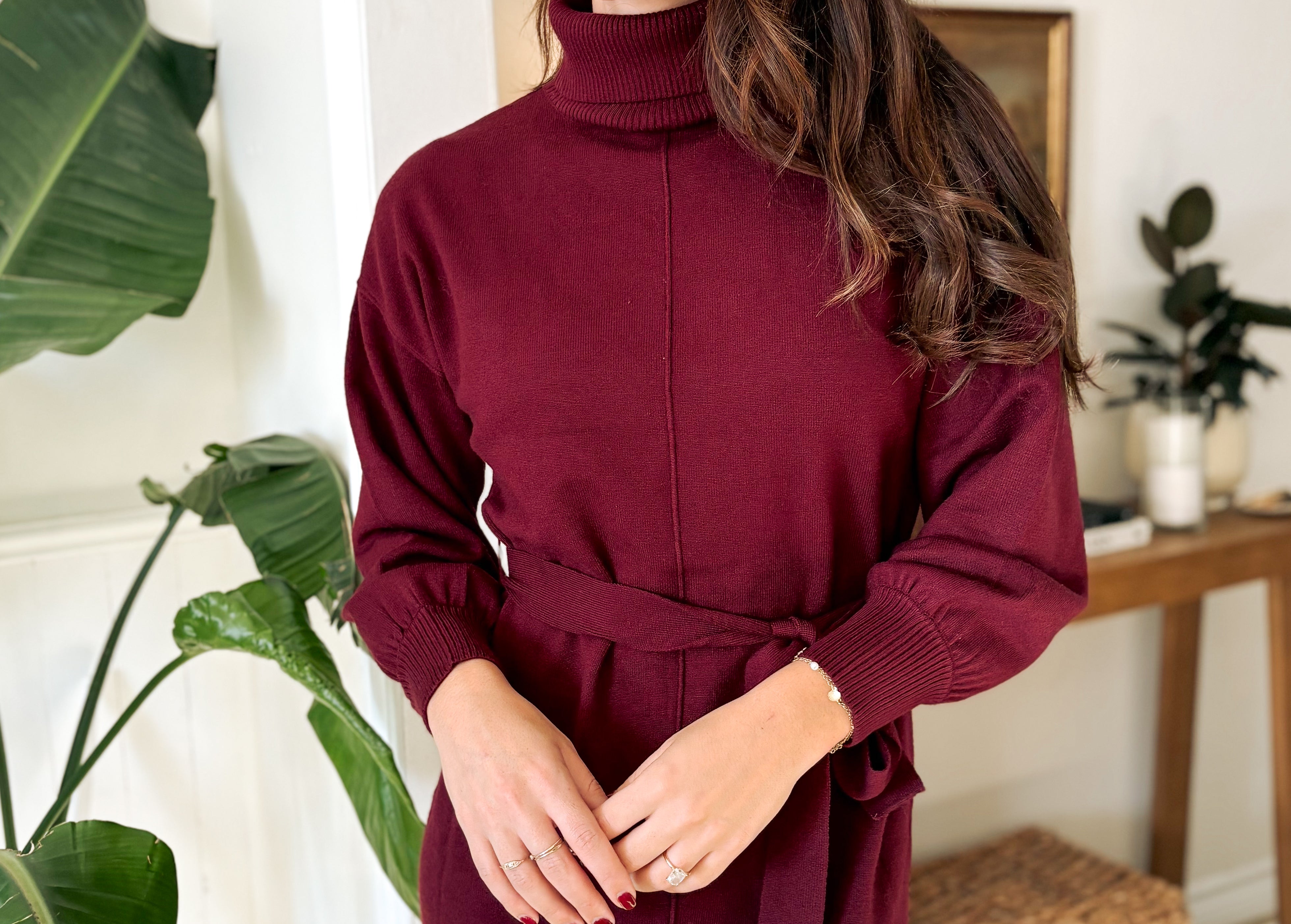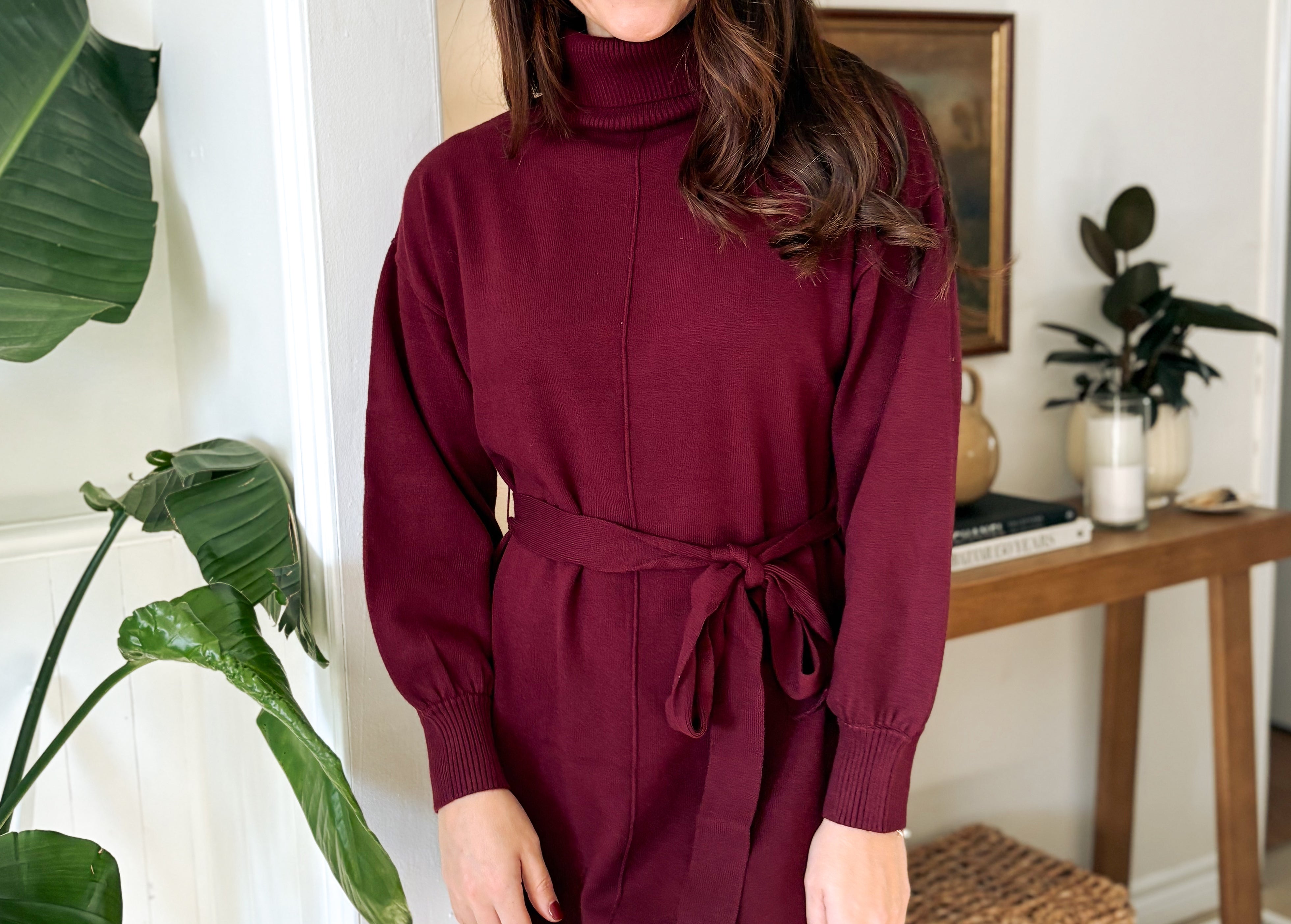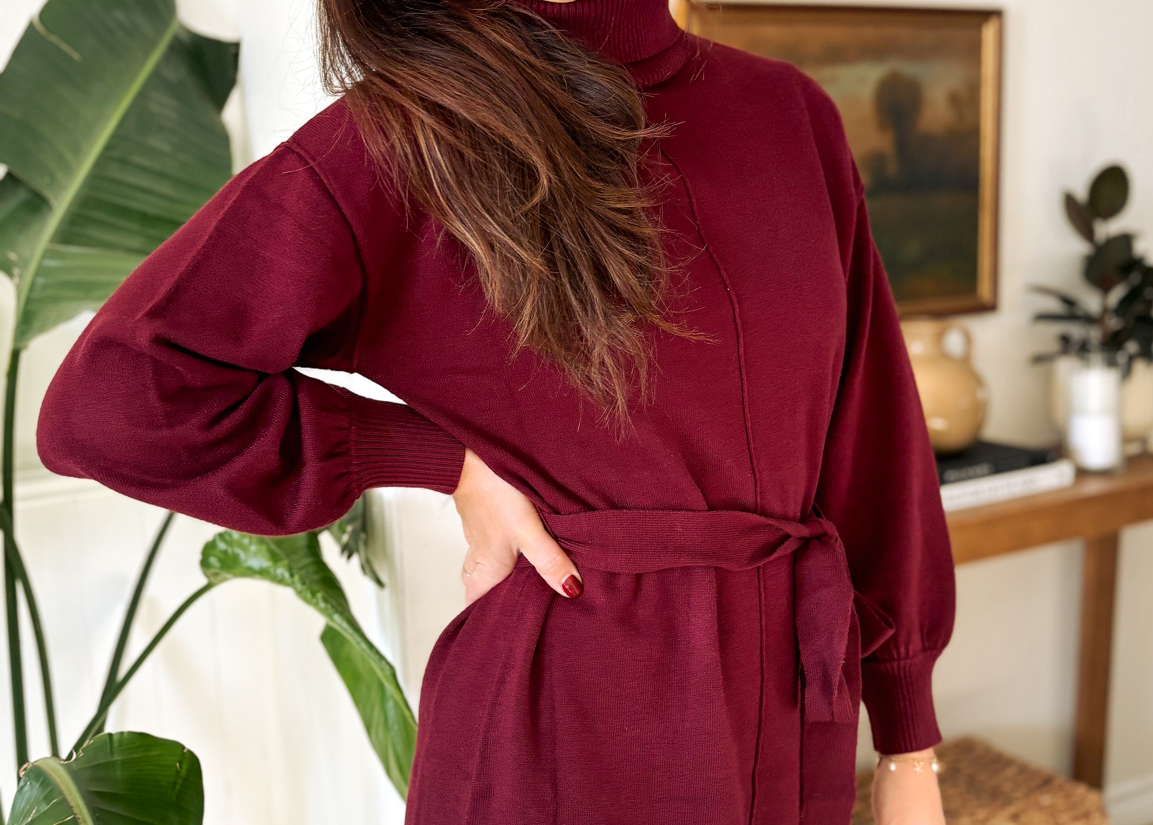 Elevate your wardrobe with The Jackie Turtle Neck Belted Sweater Dress in rich Redwood. This long-sleeve mini dress combines cozy comfort with a flattering belted waist, creating a chic silhouette that’s perfect for any occasion. The soft fabric keeps you warm while the turtleneck adds a stylish touch, making it an essential piece for cooler days. Slip into effortless elegance and embrace both style and comfort seamlessly.