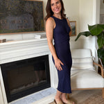 Elevate your style with the Macy Solid Sleeveless Cross Waist Bodycon Dress. Crafted from crinkle material, this navy blue dress features a flattering cross waist design that ties at the back, accentuating your silhouette. Its round neck and sleeveless cut offer a sleek, modern look, while the midi length adds a touch of elegance. Perfect for any occasion, this bodycon dress combines comfort and sophistication effortlessly.