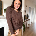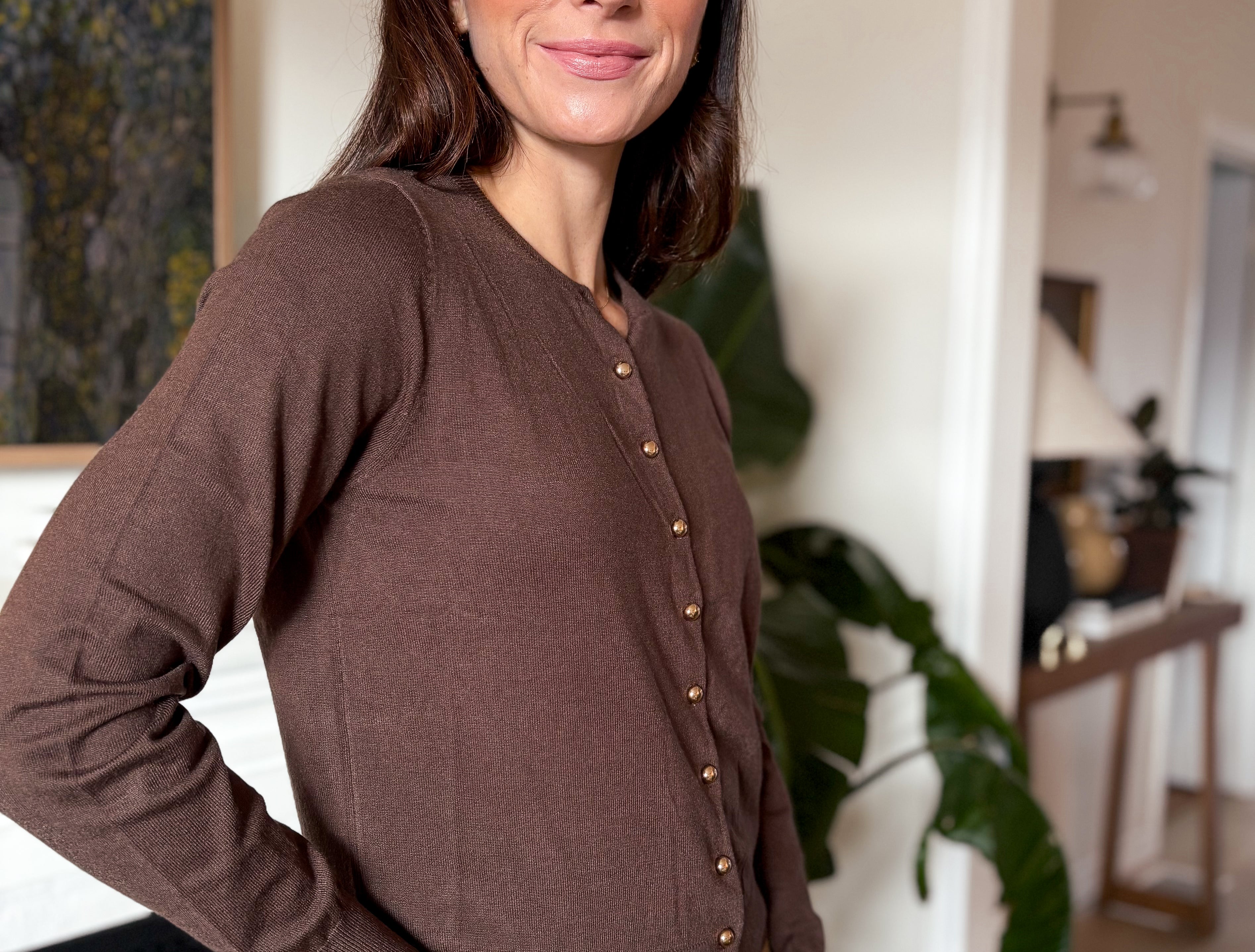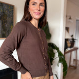 The Reina Button Down Cardigan in Mocha with Gold Buttons