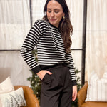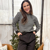 Elevate your seasonal wardrobe with The Roxanne, a timeless striped sweater that effortlessly transitions from fall into winter. Featuring distinctive buttoned shoulders and classic long sleeves, this essential piece delivers both style and versatility. The refined stripe pattern adds visual interest while maintaining the understated elegance every closet needs. Perfect for layering or wearing solo, The Roxanne is the must-have sweater that works as hard as you do—whether you're heading to the office, meeting friends, or settling in for cozy evenings at home.