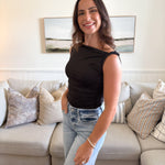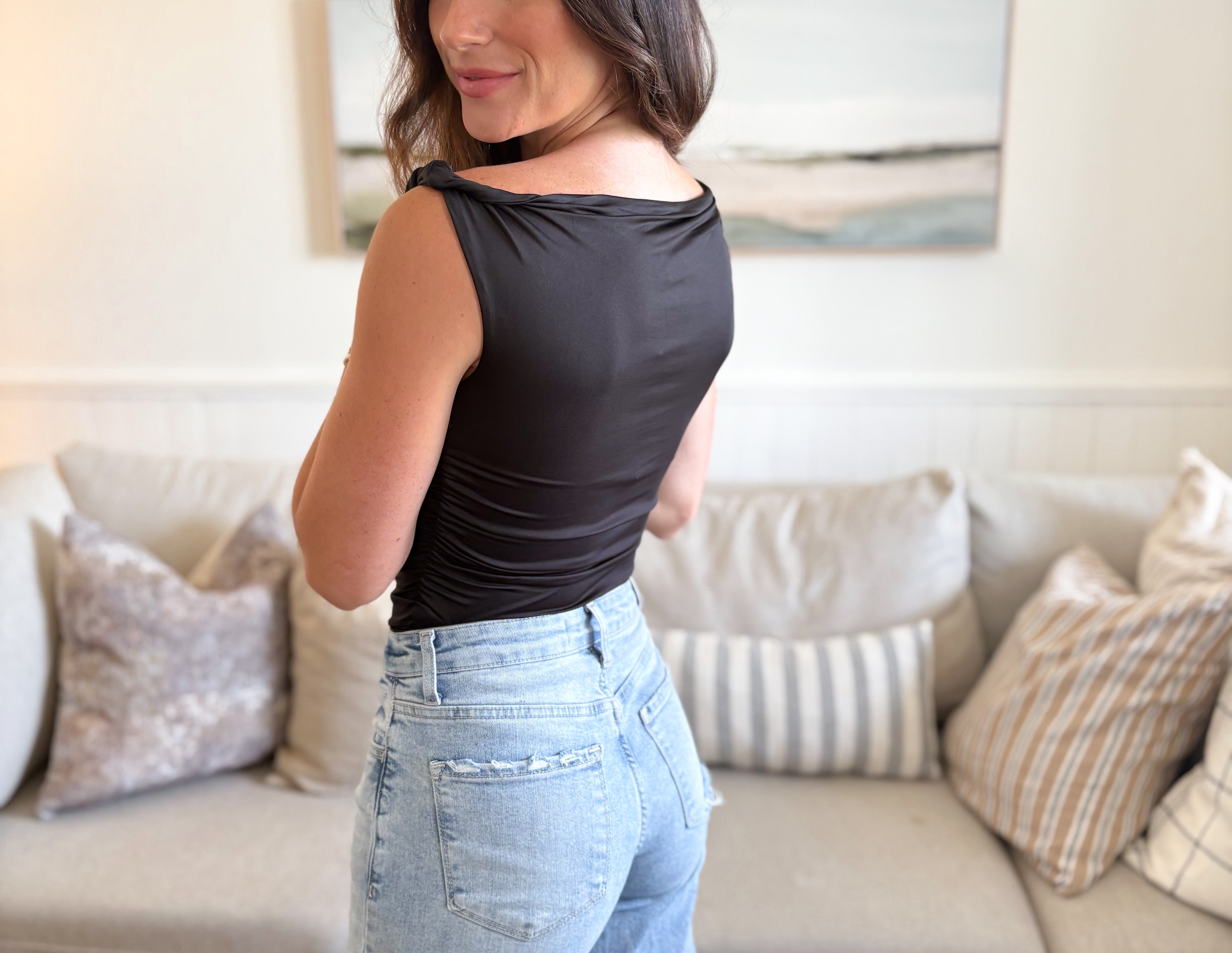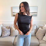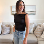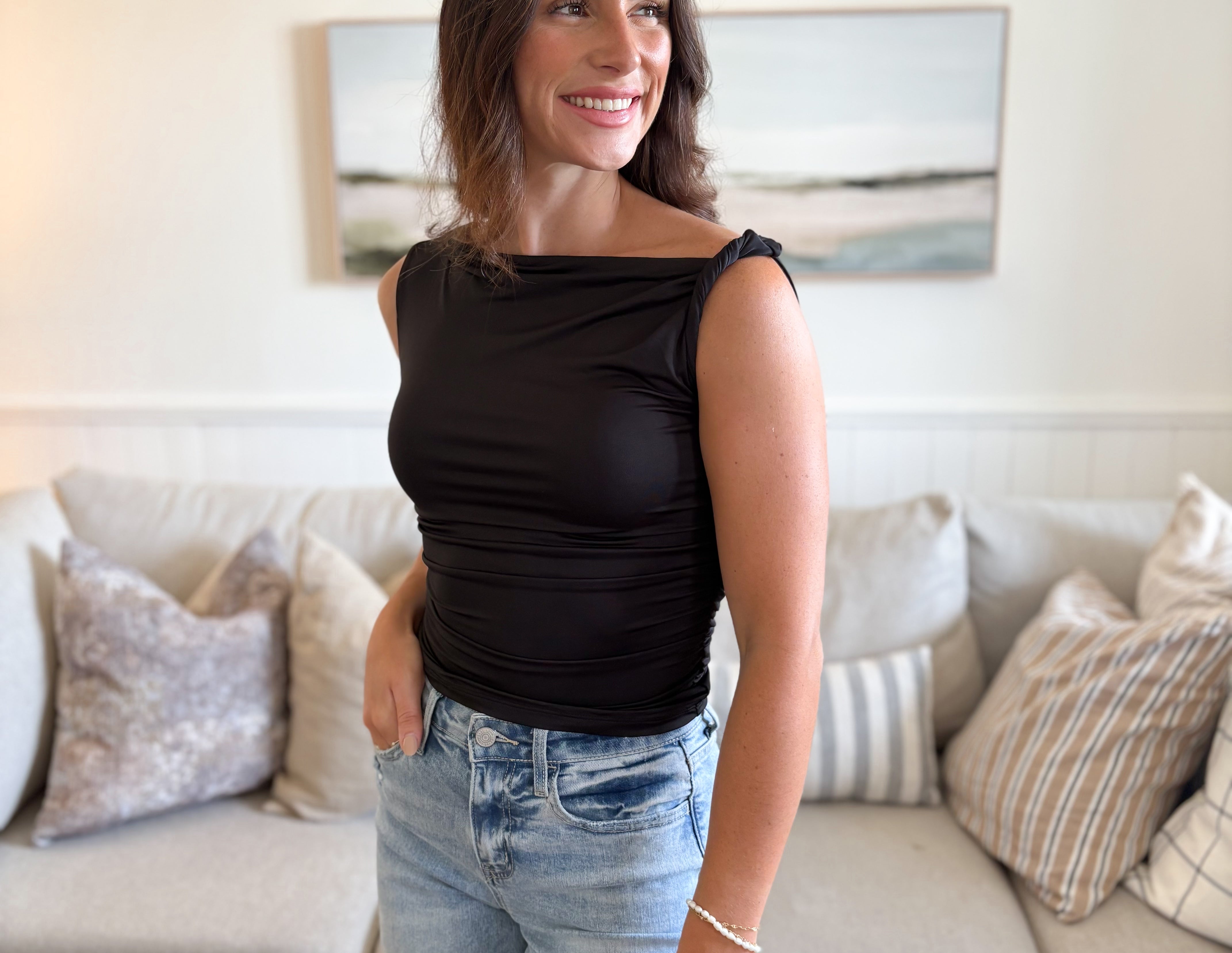 Elevate your wardrobe with the Silas Asymmetrical Off the Shoulder Knit Top in Black. Featuring a chic twist detail at the shoulder and flattering ruched sides, this sleeveless knit top offers effortless style with a modern edge. Its solid black design pairs perfectly with any outfit, while the soft, unlined fabric ensures breathable comfort for all-day wear. Make a bold statement with this sophisticated, versatile piece.