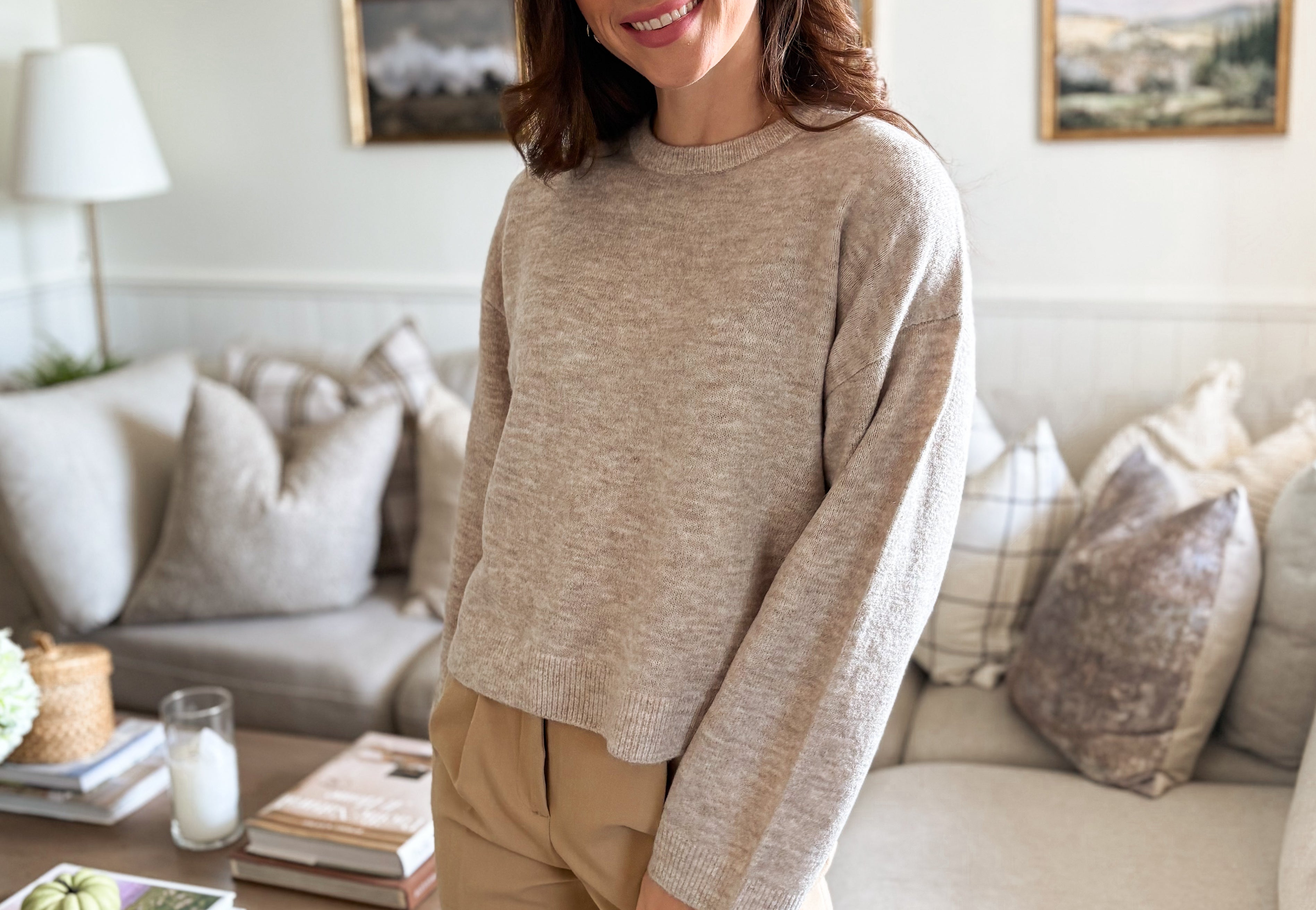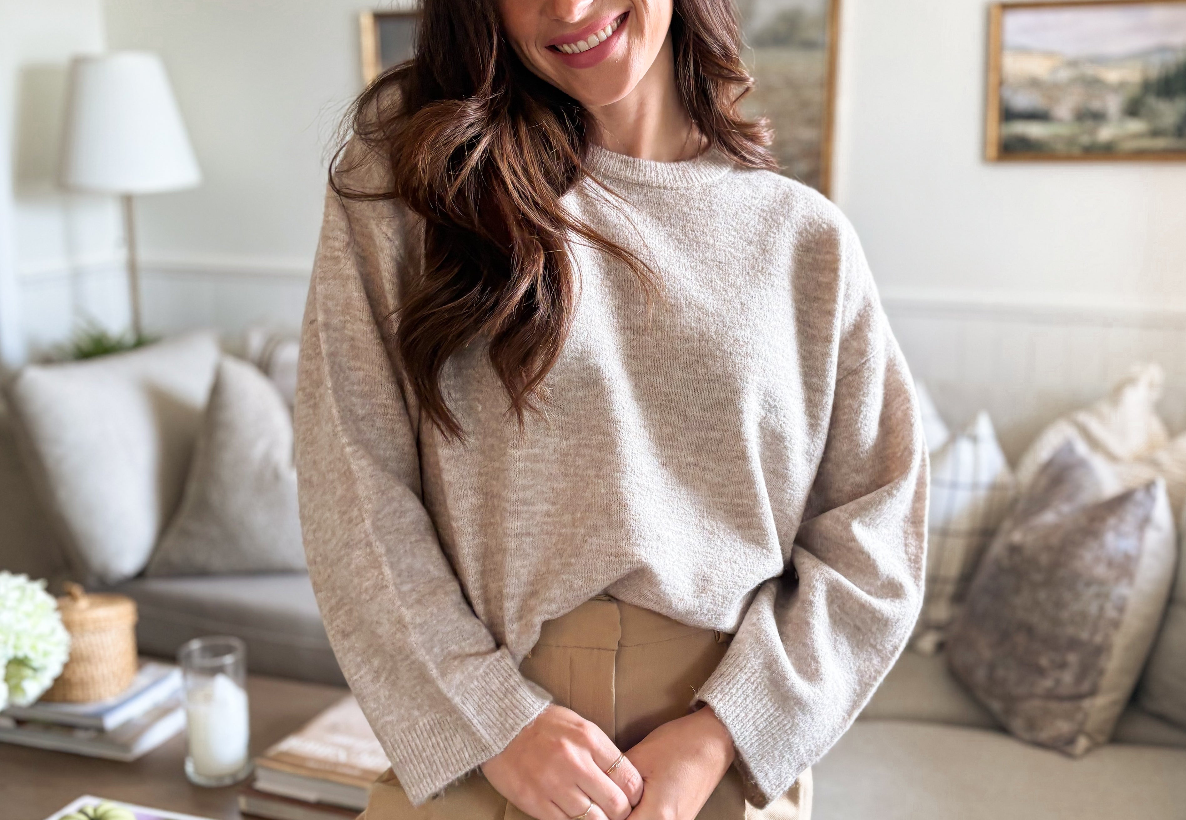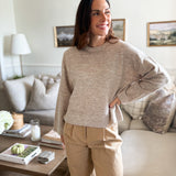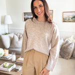 The Simone Knit Pullover Sweater offers cozy comfort with its soft knit fabric and flattering round neckline. Featuring ribbed cuffs, neckline, and waistband, it ensures a snug fit that stays in place throughout the day. Its gentle mocha hue adds a warm, versatile touch perfect for layering or wearing on its own. Elevate your wardrobe with this effortlessly stylish and comfortable sweater.