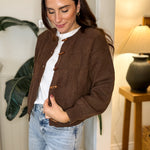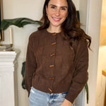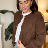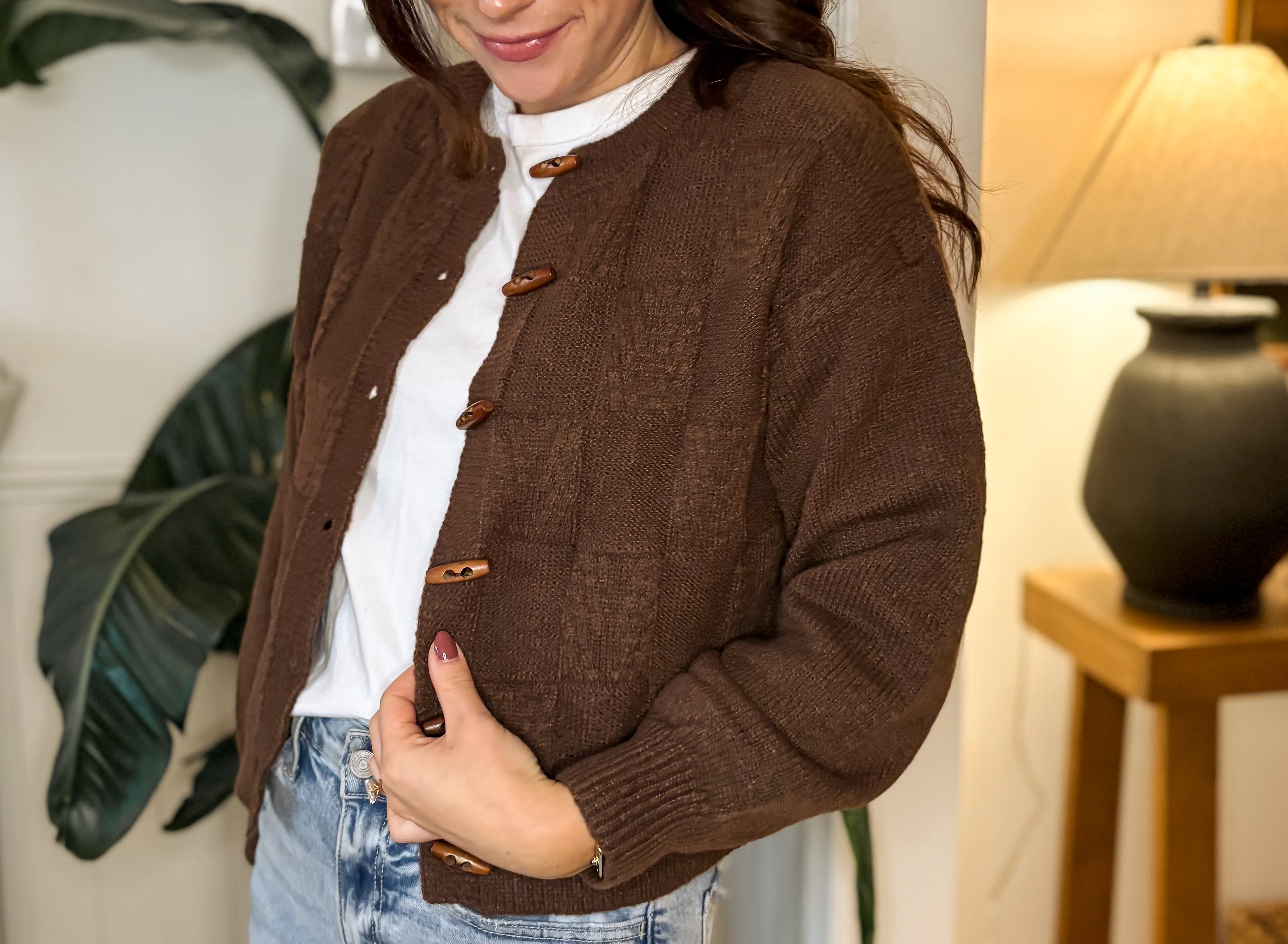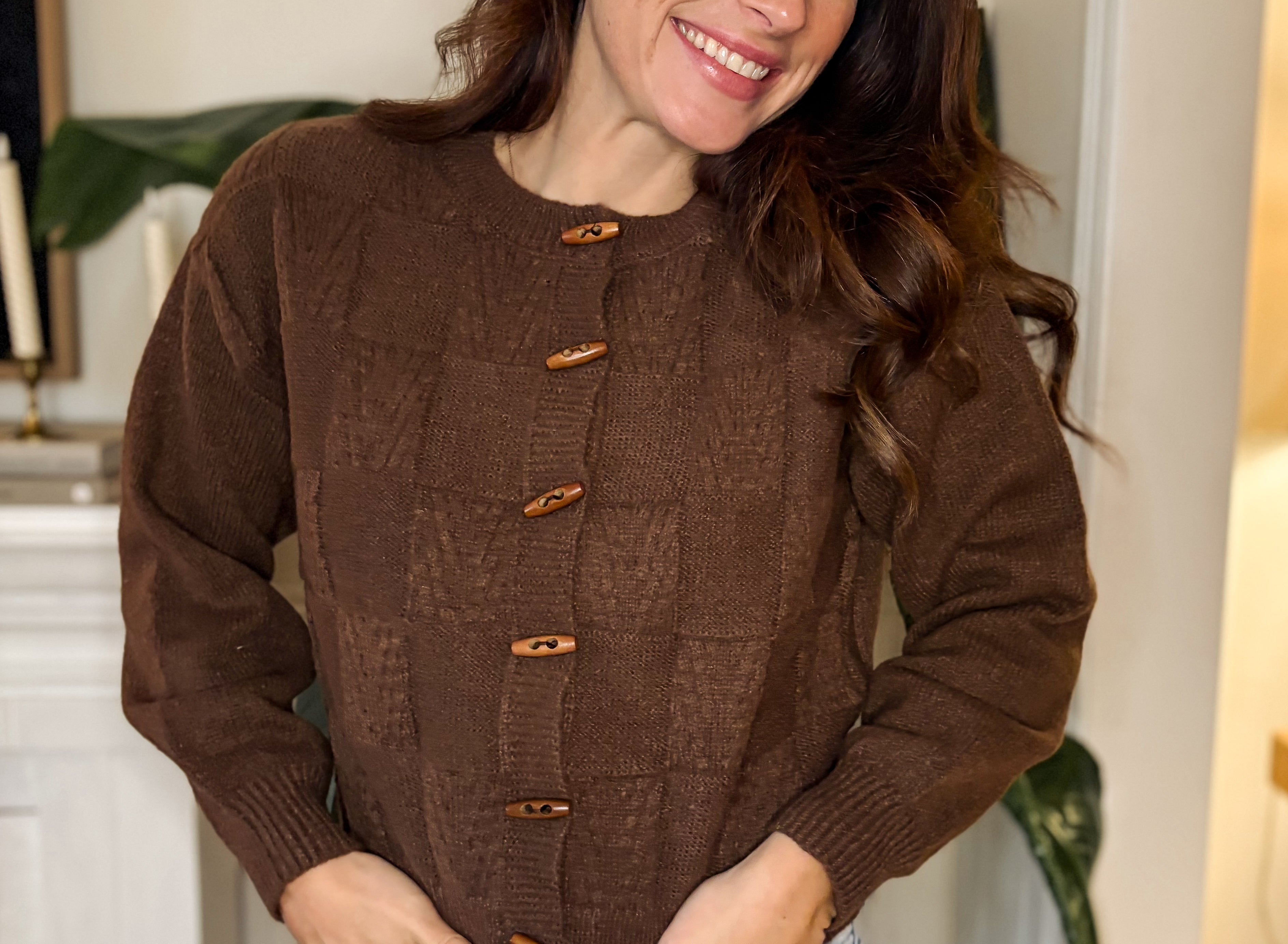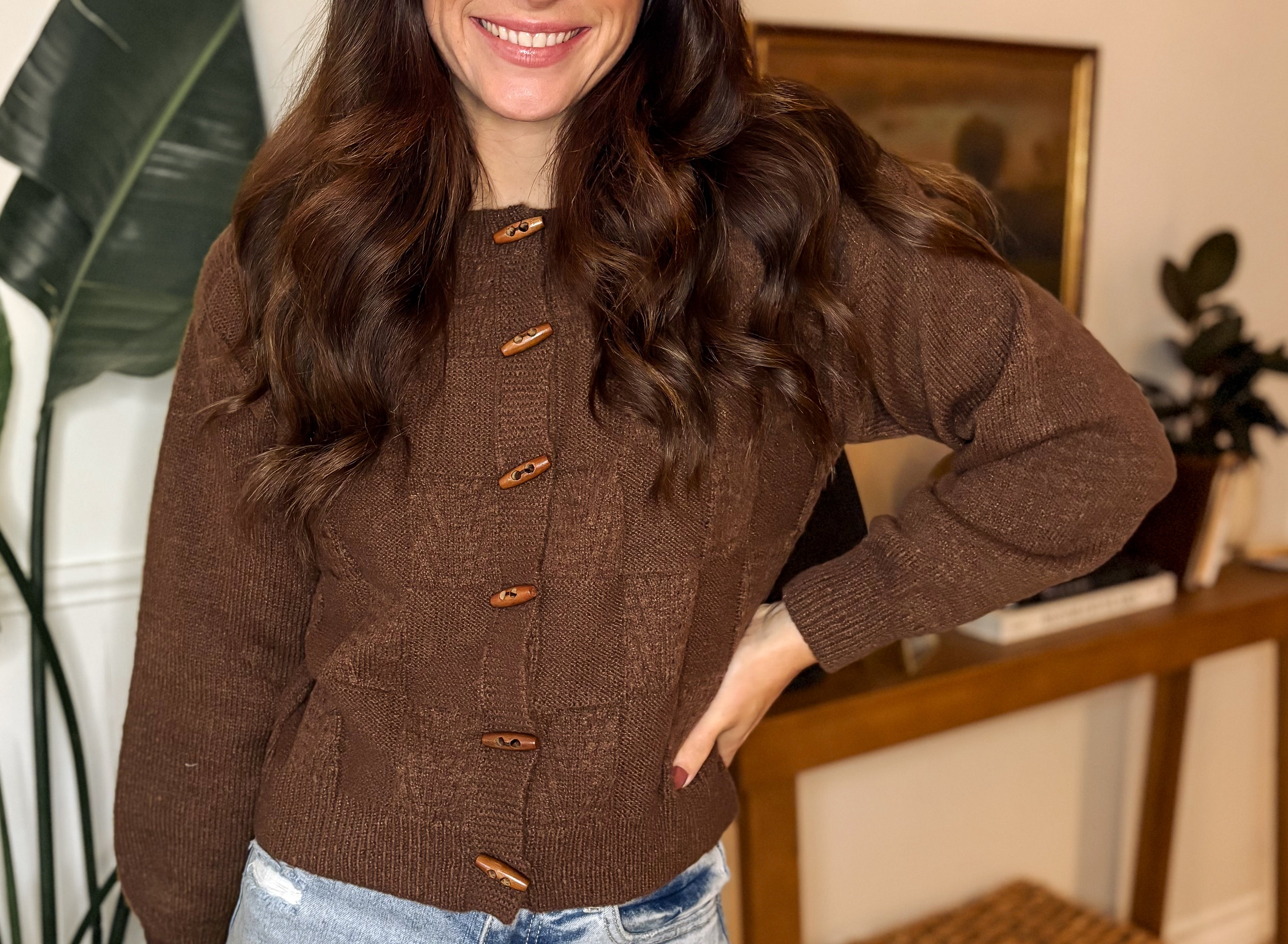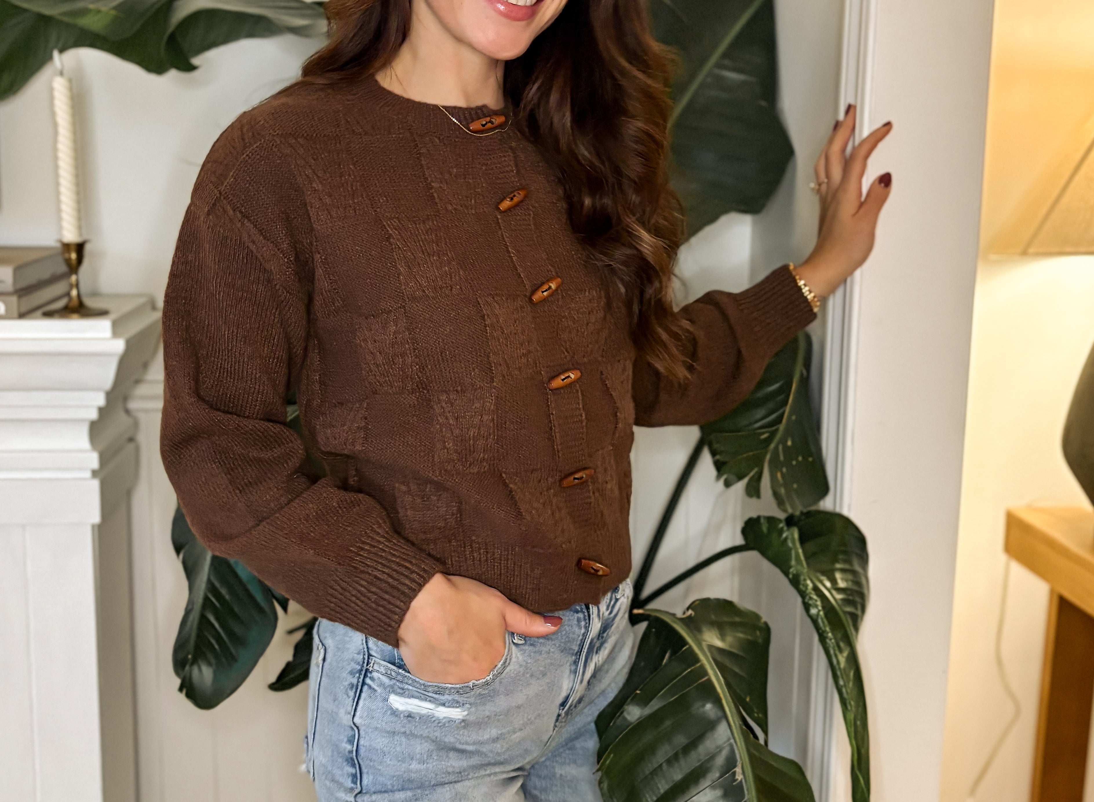 Elevate your wardrobe with the Checkered Toggle Button Down Knit Cardigan, a perfect blend of style and comfort. Crafted with a cozy knit fabric, this cardigan features a classic checkered pattern and distinctive toggle buttons that add a unique touch. Ideal for layering, it keeps you warm while enhancing any outfit with a timeless, chic look. Whether for casual days or cozy evenings, this cardigan offers effortless versatility and lasting comfort. The rich chocolate brown colour adds a touch of sophistication.