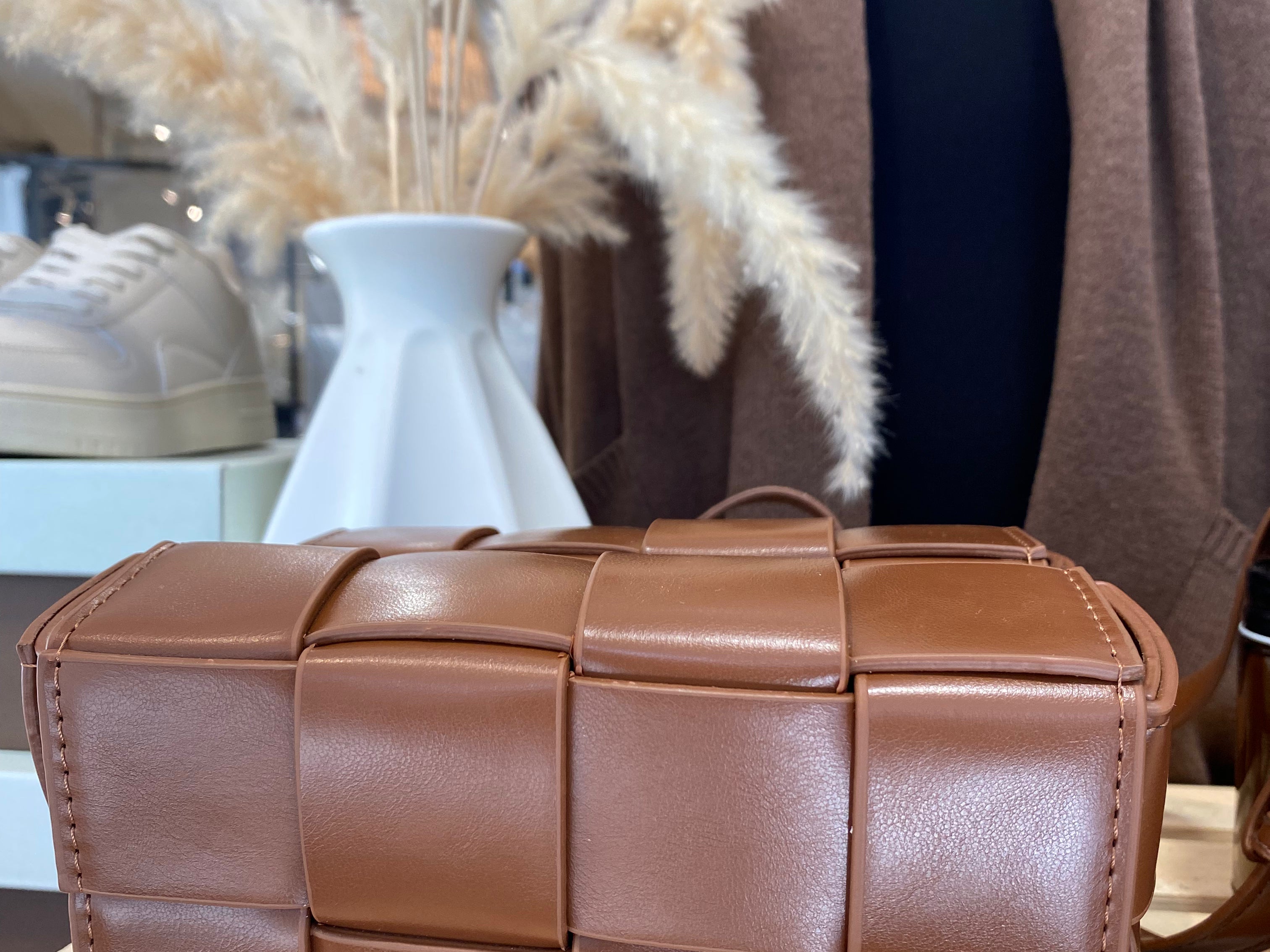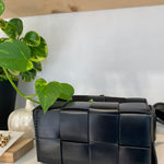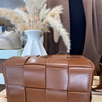 VEGAN LEATHER WOVEN CROSSBODY WAIST BAG - CHIC WOVEN DESIGN - ADJUSTABLE STRAP, SECURE CLOSURE - DURABLE AND EASY TO CLEAN - COMPACT YET SPACIOUS - LENGTH: 7.67", WIDTH: 2.16", HEIGHT: 3.93"