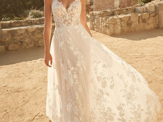 True to its namesake season, this whimsical lace A-Line wedding gown is both delicate and dramatic, sweet yet striking, timeless yet unique. (And just think of the snowy accessory potential.)